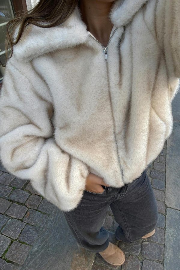 Kort pälsjacka med stor krage. Jackan är krämfärgad och har dragkedjestängning framtill. Den har fickor i sidorna, fluffig kvalitet, normal passform, långa puffärmar och rund halsringning. Fodrad.