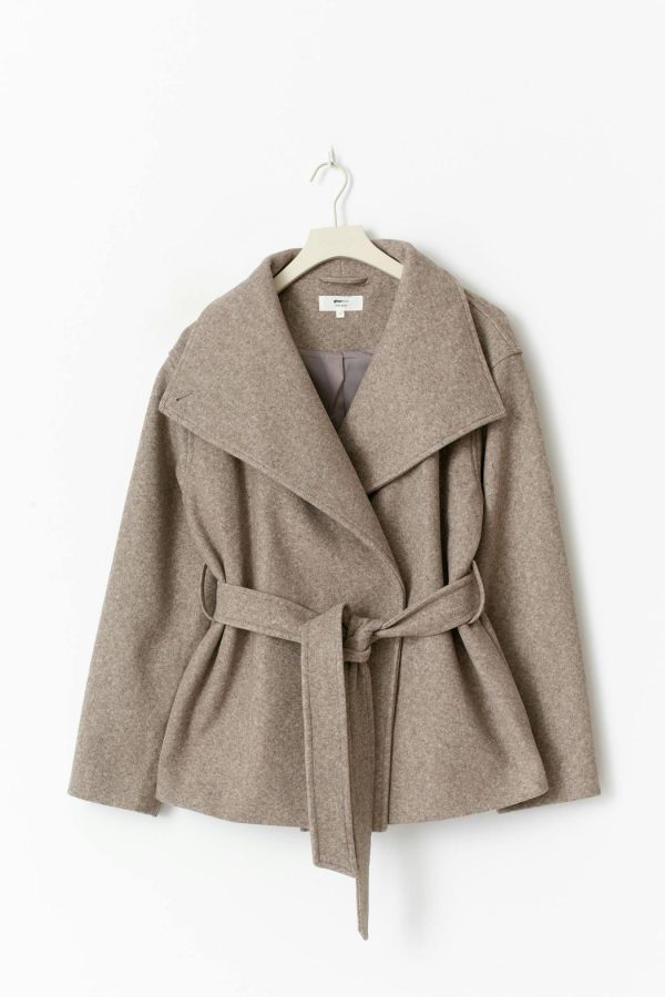 Jacka med en krage. Jackan är beige och har ett knytbälte i midjan. Den har fickor, knäppen fram och en normal passform.