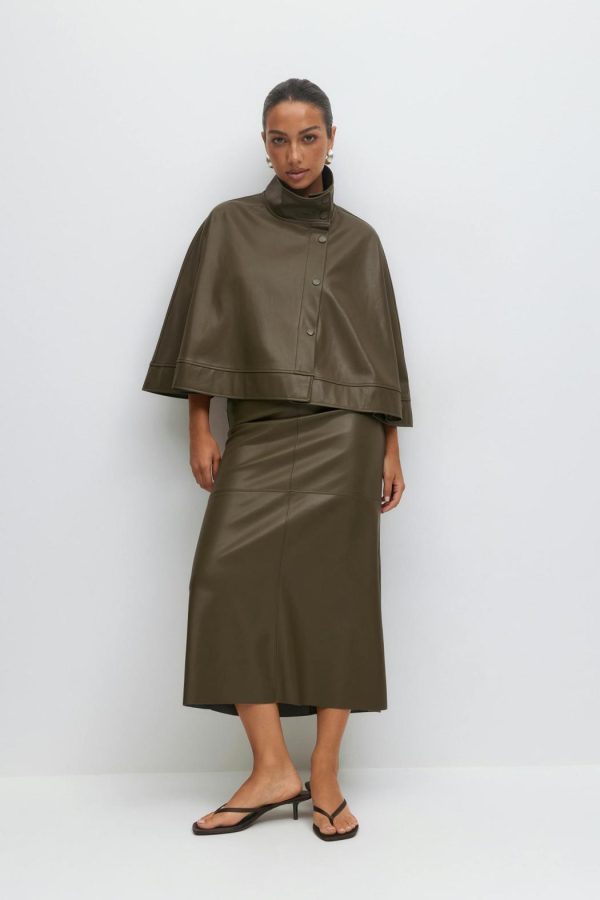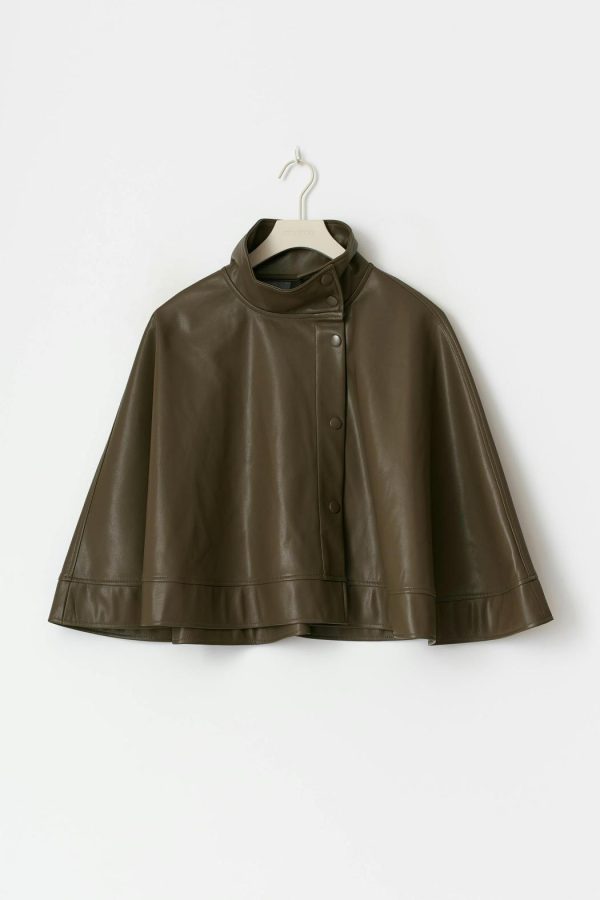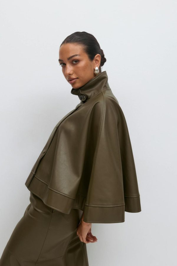 Cape i läderimitation med hög krage. Kappan är grön och har lös passform. Den har tryckknappar fram och kort längd.