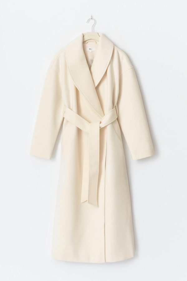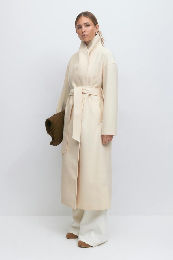 Lång kappa med knytskärp i midjan. Kappan är krämfärgad och har oversize fit. Den har fickor i sidorna, sjalkrage, dold knäppning framtill och slits bak.
