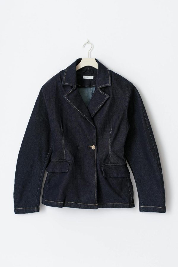 Figursydd kavaj i jeanstyg med axelvaddar. Jackan är mörkblå och har krage med slag. Den har knäppning framtill, långa ärmar och normal passform. Utan stretch.