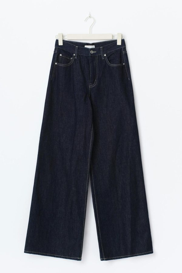 Petite jeans med kortare benlängd. Jeansen är mörkblåa och har superhög midja. De har vida ben med fullängd, dragkedjegylf och fickor fram och bak. Utan stretch. Passar för dig som är 160 cm eller kortare. Se gärna vår storleksguide för att hitta din storlek.