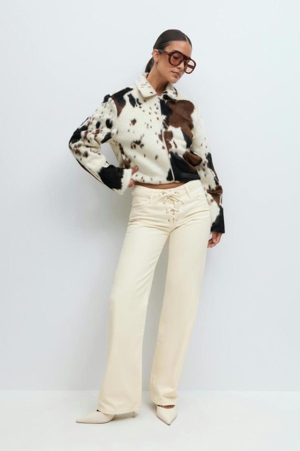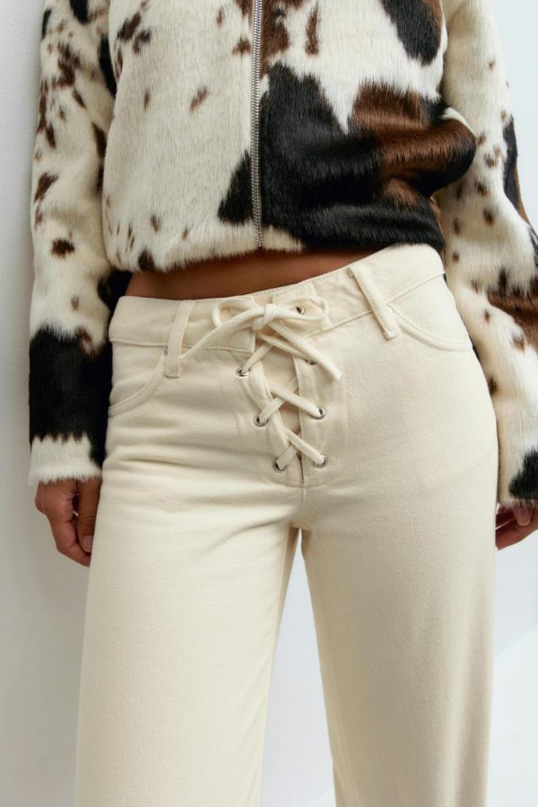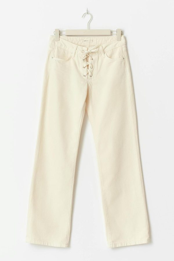 Low waist jeans med snörning vid grenen. Jeansen är vita och har raka ben med fullängd. De har låg midja, bälteshällor, normal passform och fickor fram och bak. Utan stretch.