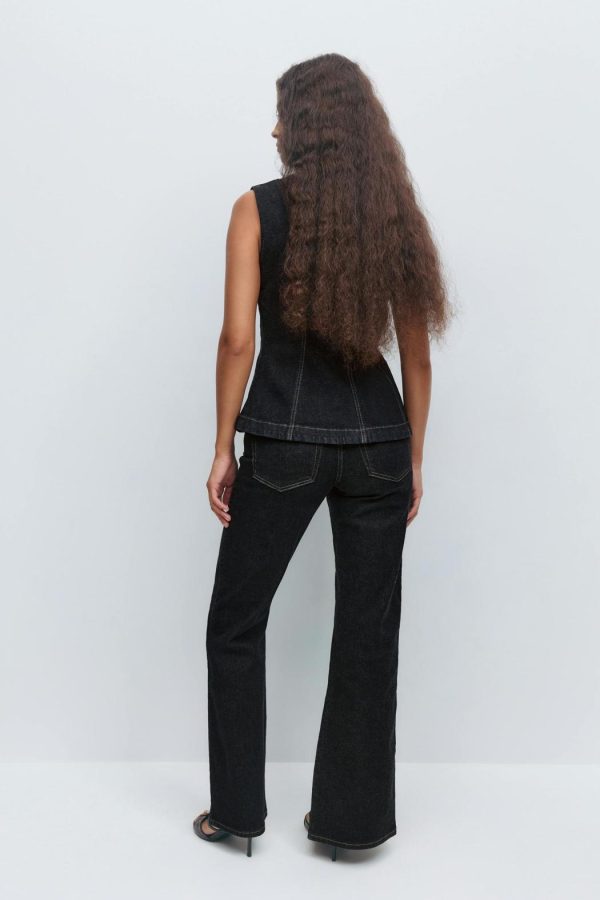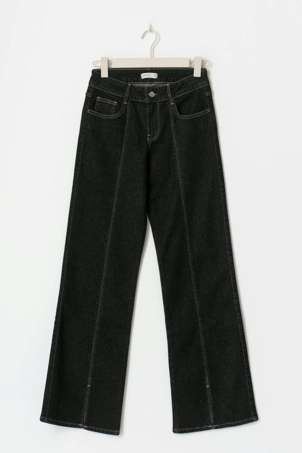 Raka jeans med slits framtill. Jeansen är mörkblåa och har låg midja. De har raka ben med normallängd, sömmar framtill, stretchig kvalitet, bälteshällor, dragkedjegylf och fickor fram och bak. Se gärna vår storleksguide för att hitta din storlek.