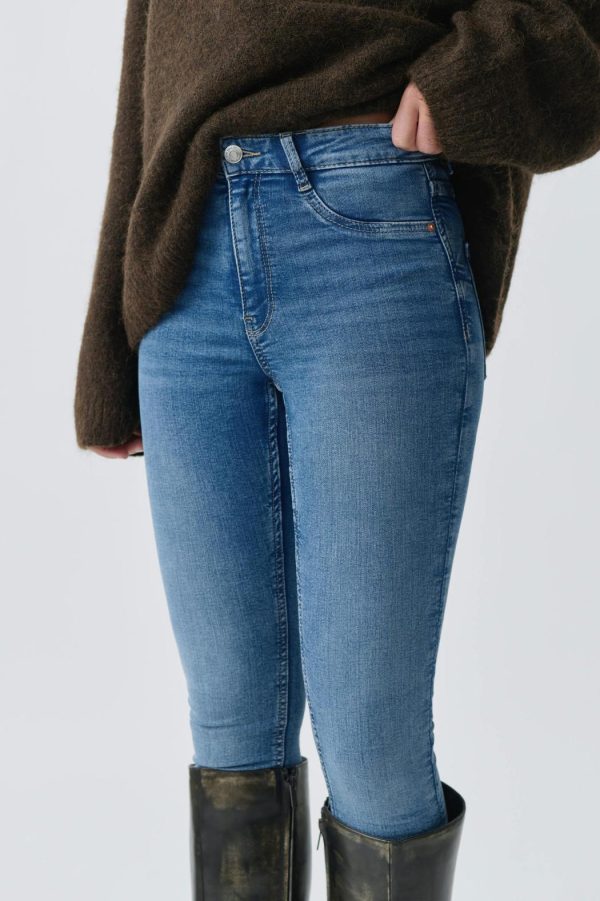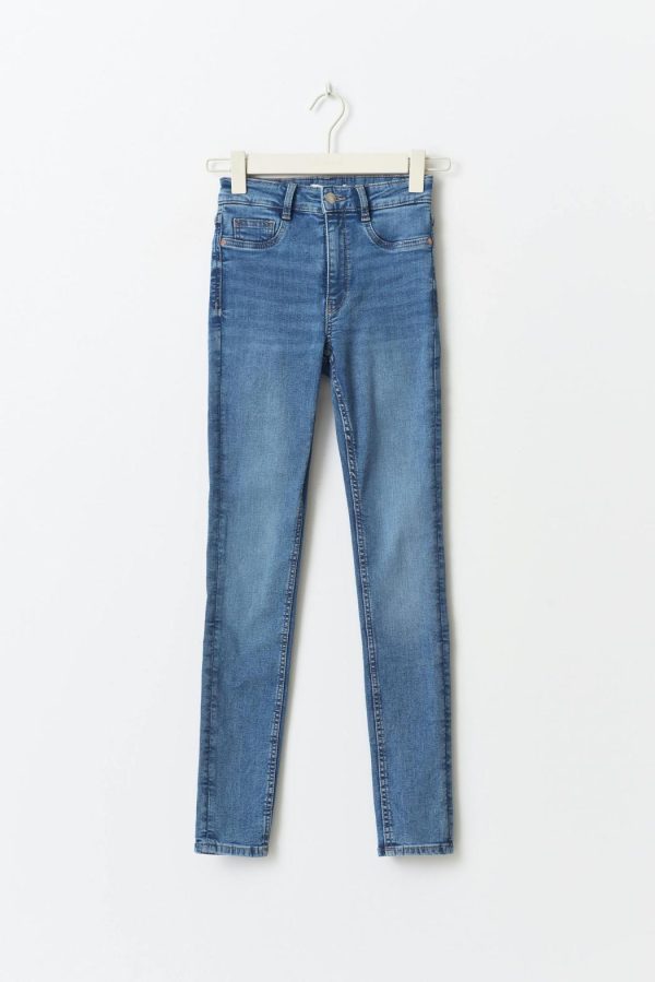 Superstretchiga skinny jeans med hög midja. Jeansen är blåa och har figurnära, bekväm passform med smala ben. De har dragkedjegylf, fuskfickor fram och riktiga bakfickor. Se gärna vår storleksguide för att hitta din storlek.