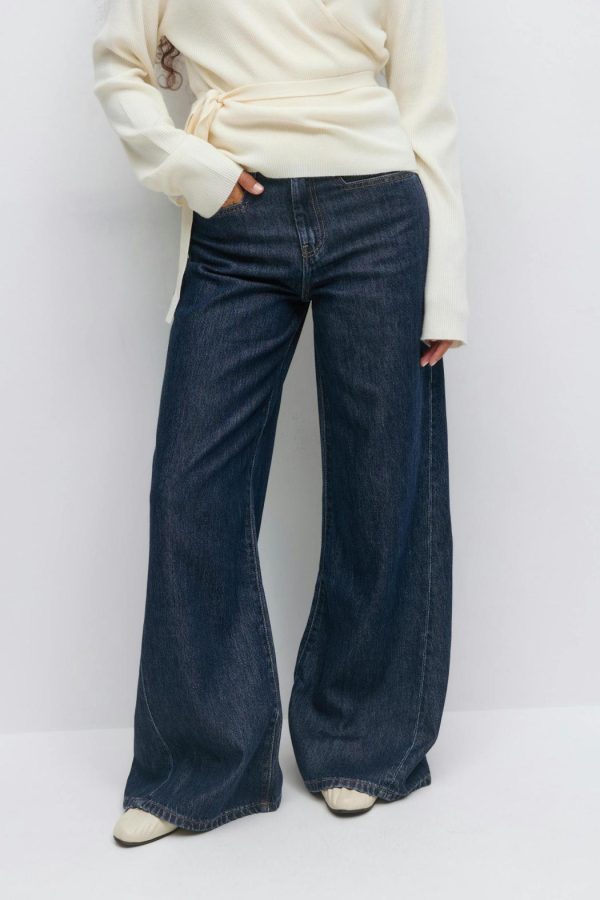 Jeans utan stretch med en hög midja. Jeansen är mörkblåa och har vida ben. De har en vriden söm nedtill, en knäppning i sidorna, en dragkedjegylf och fickor fram och bak.