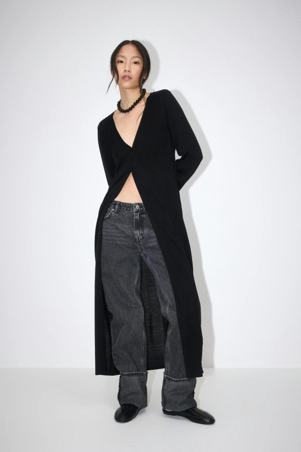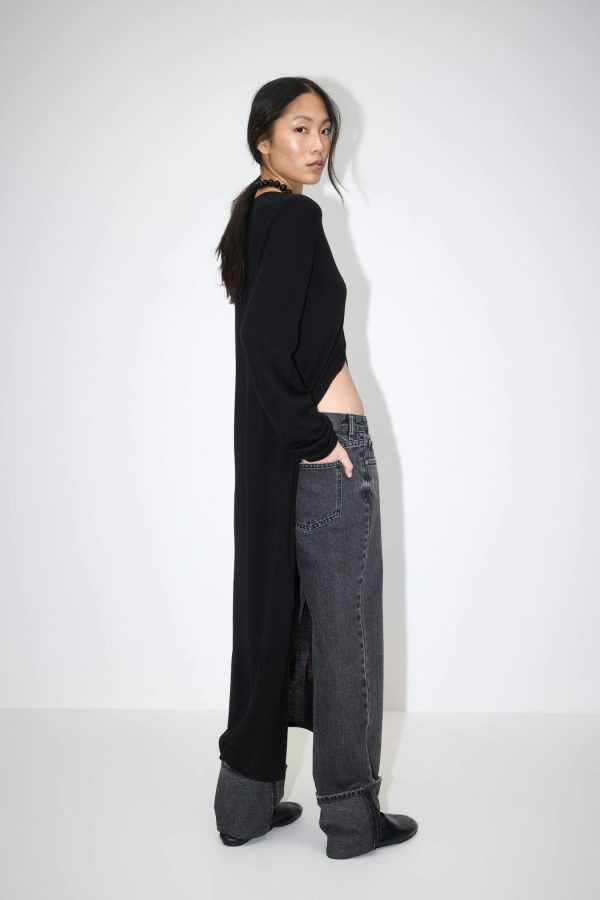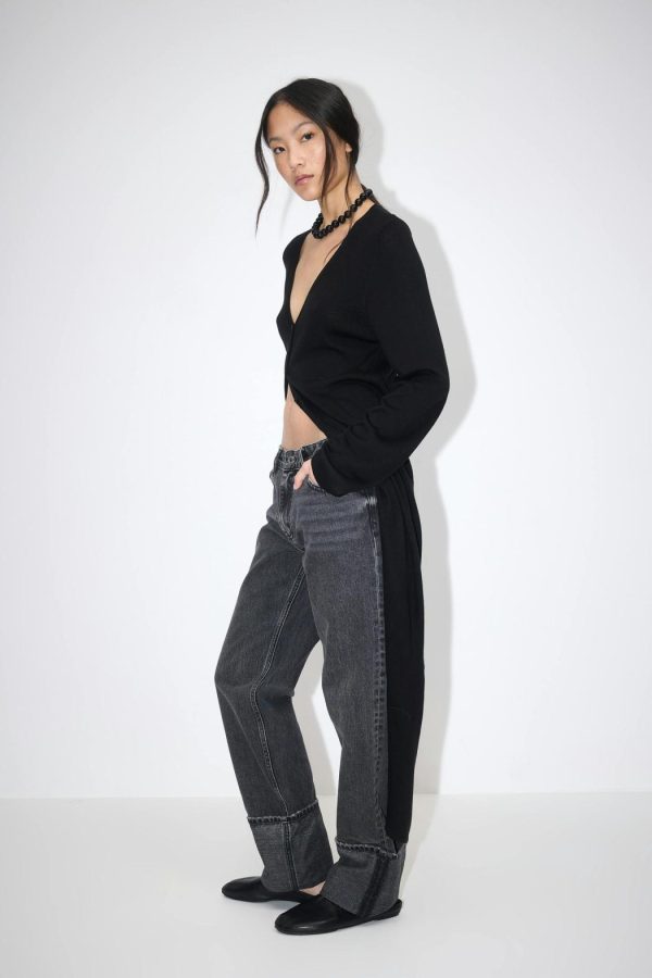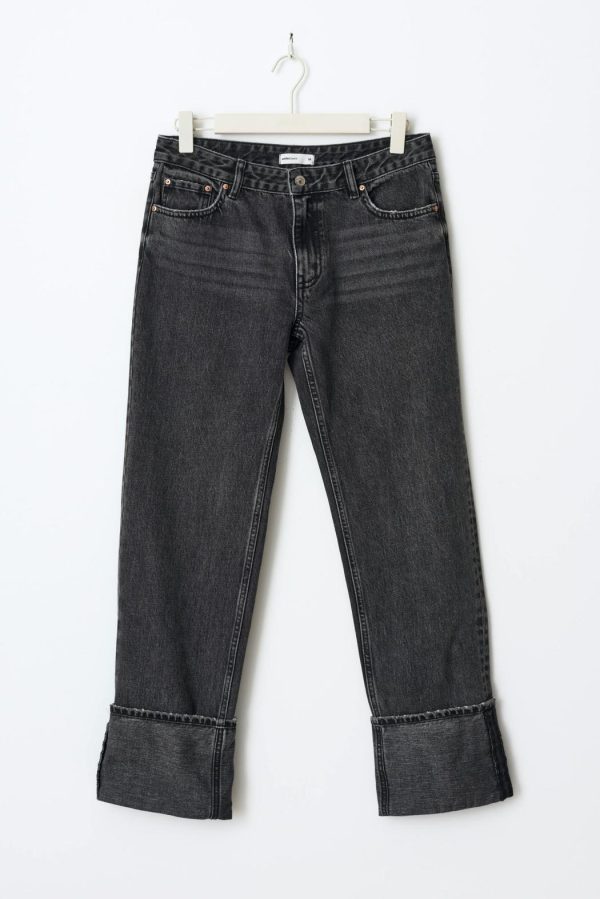 Jeans med uppvikta ben. Jeansen är gråa och har låg midja. De har normal passform i denim utan stretch, dragkedjegylf, raka ben med fullängd och fickor fram och bak.