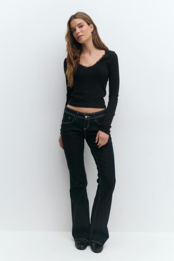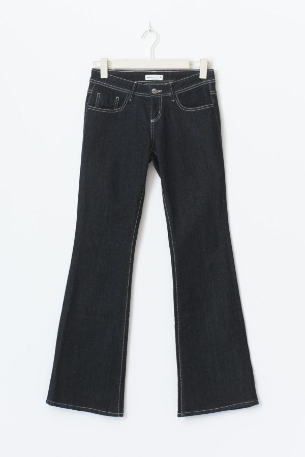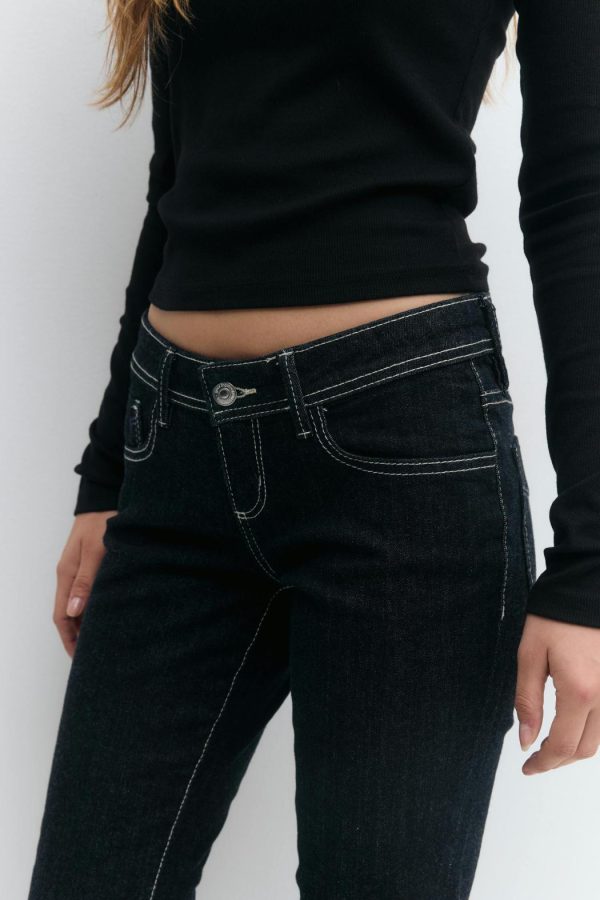 Flare jeans med låg midja. Jeansen är mörkblåa och har utsvängda ben med normallängd. De har figurnära passform, dekorativa sömmar, dragkedjegylf, bälteshällor, stretchig kvalitet och fickor fram och bak. Se gärna vår storleksguide för att hitta din storlek.