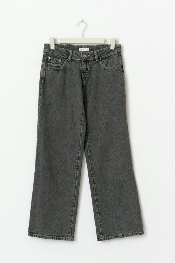 Petite jeans med låg midja. Jeansen är gråa och har vida ben med fullängd. De har komfortstrech, normal passform, dragkedjegylf, midjeband med bälteshällor, framfickor och bakfickor med sömdetaljer. Passar för dig som är 160 cm eller kortare.