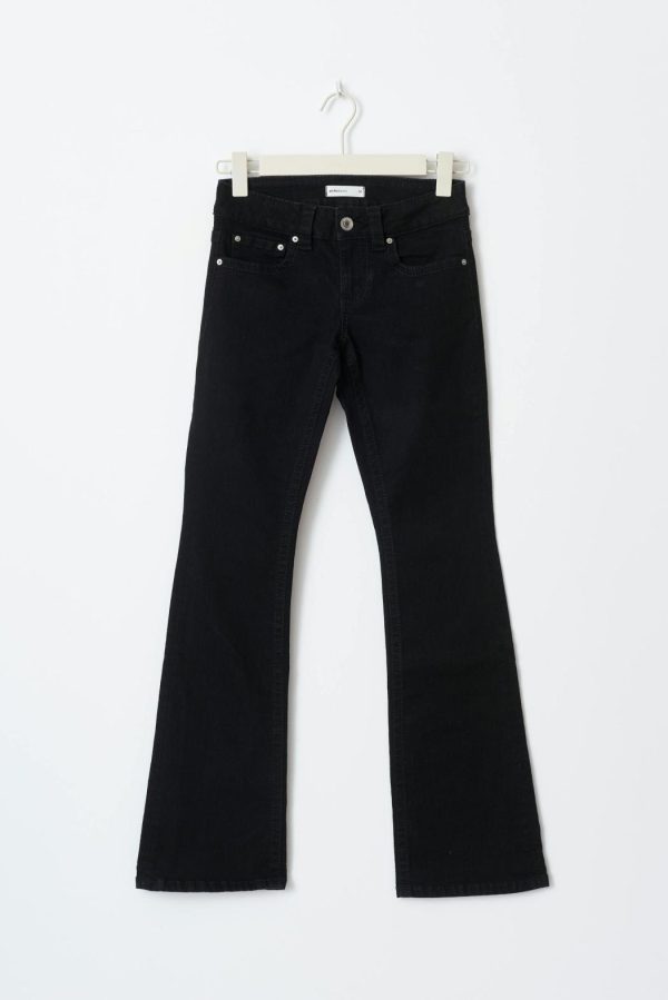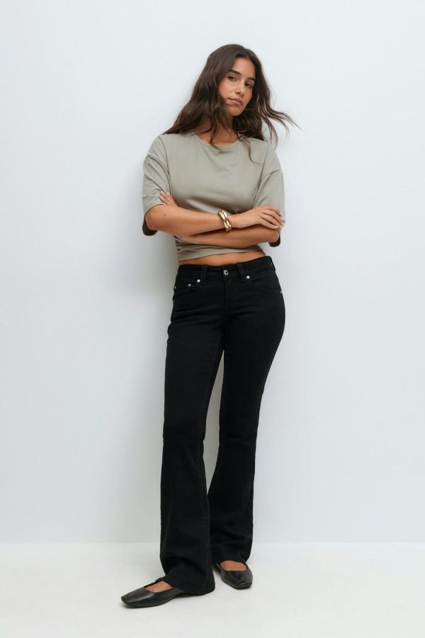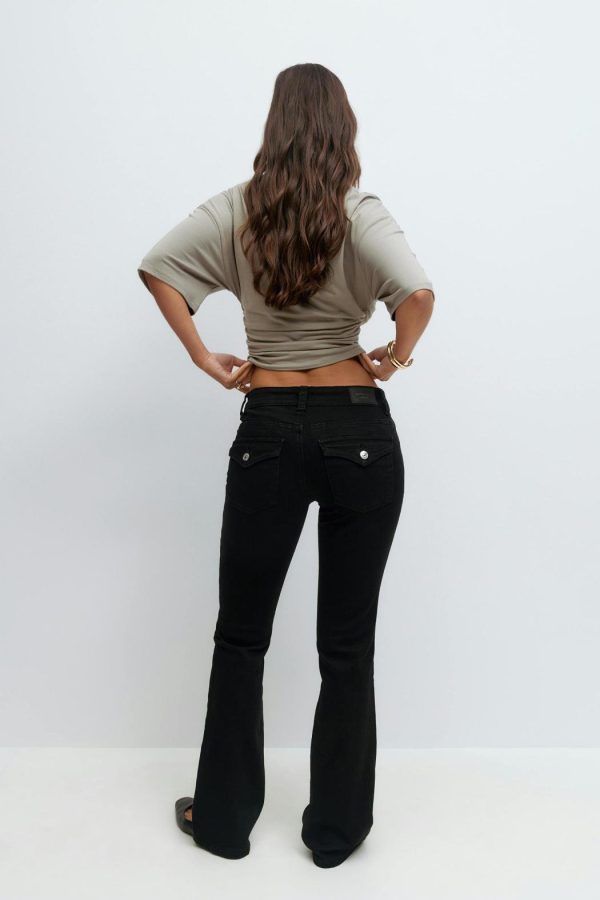 Lågmidjade bootcut jeans med figurnära passform. Jeansen är svarta och har utsvängda ben med normallängd. De har stretchig kvalitet, bälteshällor, framfickor och bakfickor med lock och knapp.