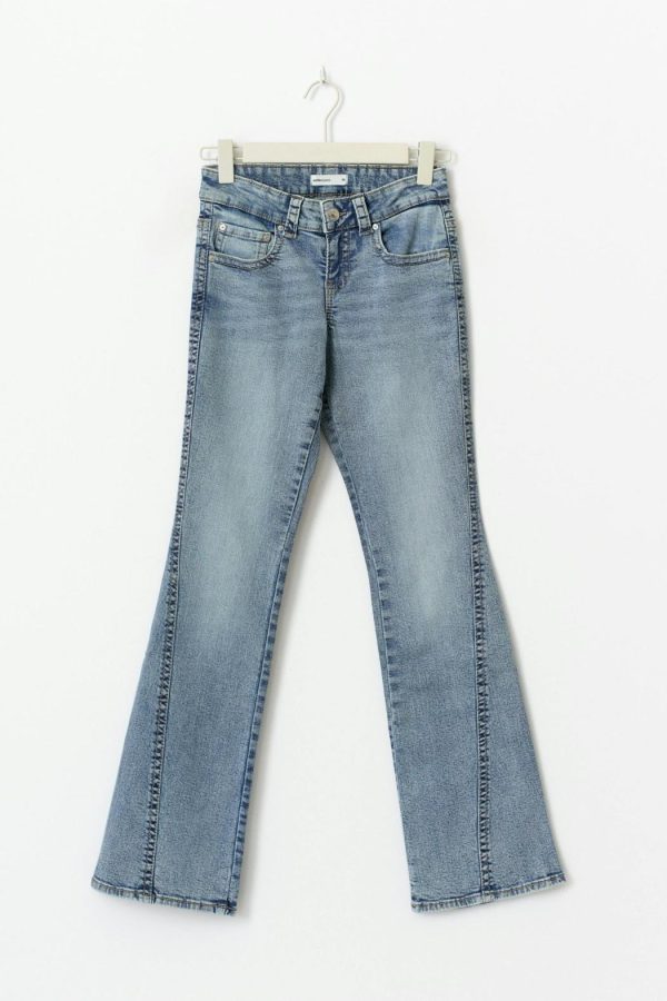Petite bootcut jeans med låg midja. Jeansen är blåa och har broderade bakfickor med lock och knapp. De har stretchig kvalitet, figurnära passform, dragkedjegylf, vridna sömmar, utsvängda ben med normallängd och fickor fram och bak. Se gärna vår storleksguide för att hitta din storlek.