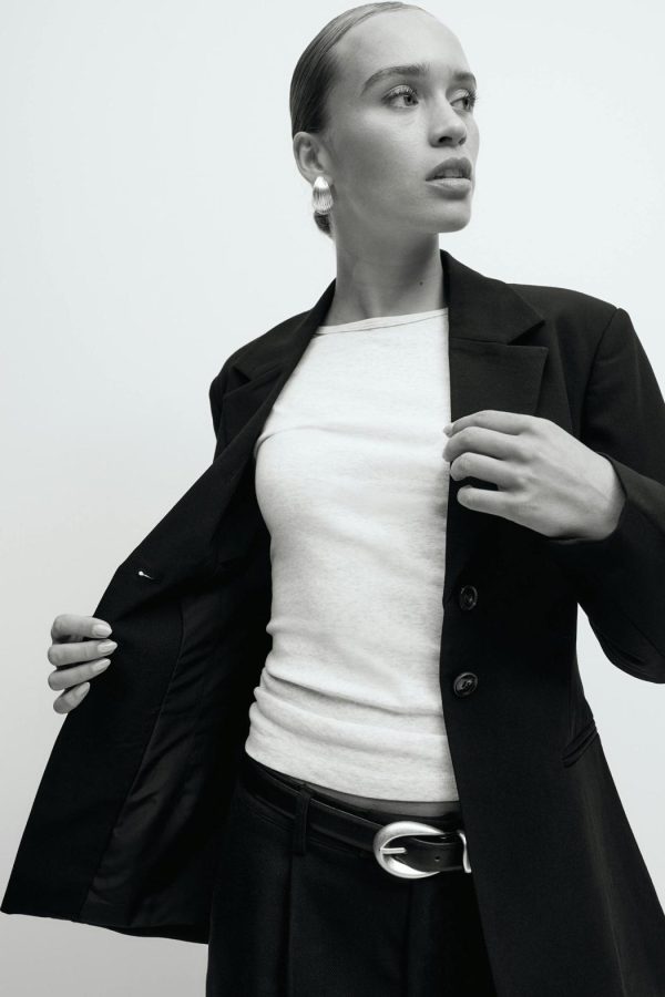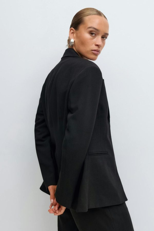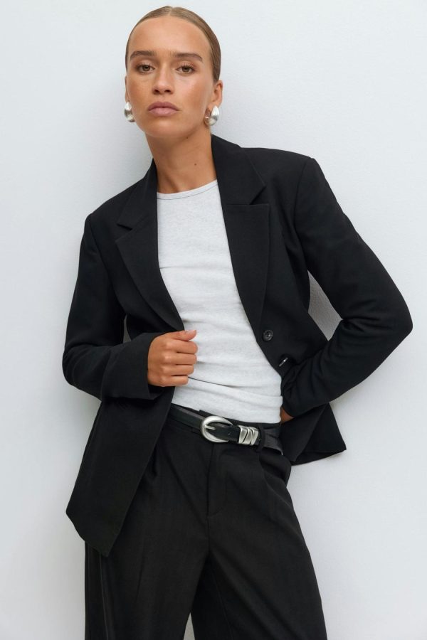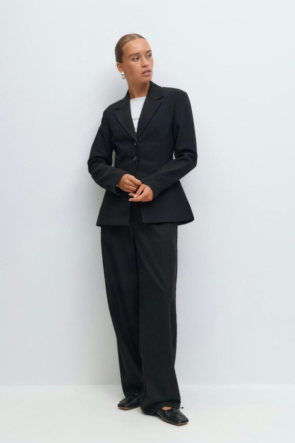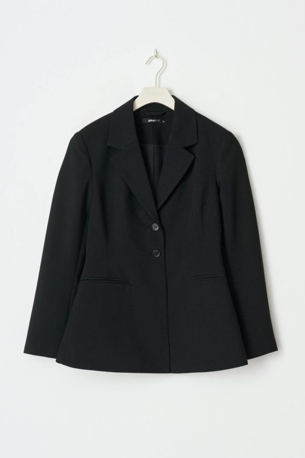 Figursydd kavaj med intagen midja. Jackan är svart och har krage med slag. Den har slim fit, lång ärm, passpolerade fickor i sidorna och två knappar fram.