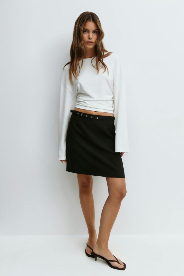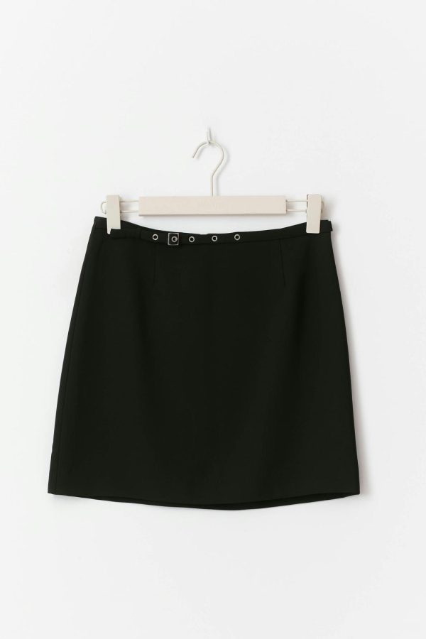Kort kjol med tunt bälte med nitar. Kjolen är svart och har en medelhög midja. Den har dragkedjestängning baktill och en normal passform. Fodrad.
