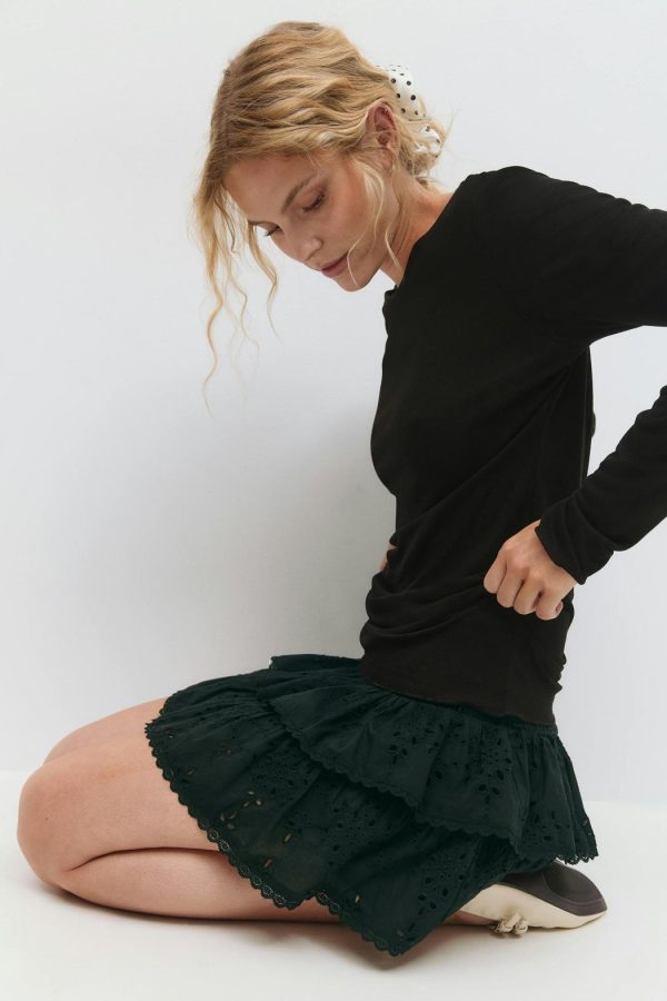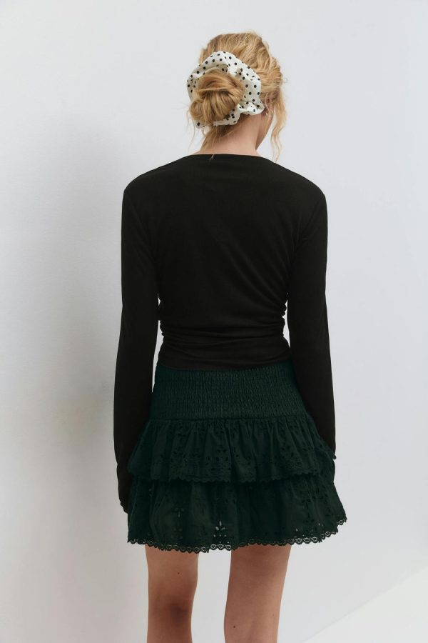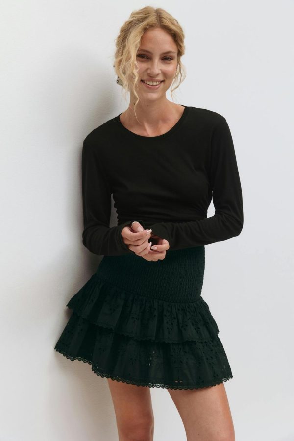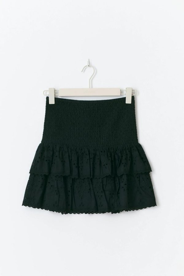 Kort volangkjol med broderi. Kjolen är svart och har en smockad midja. Den har en normal passform.
