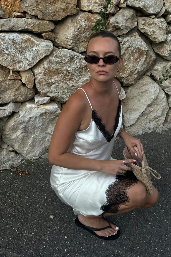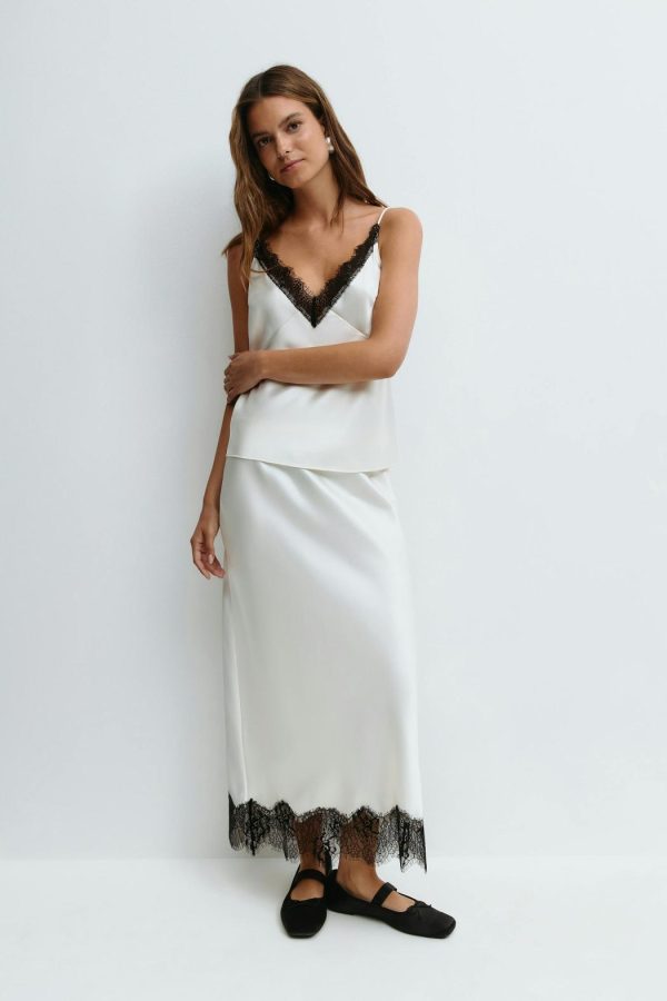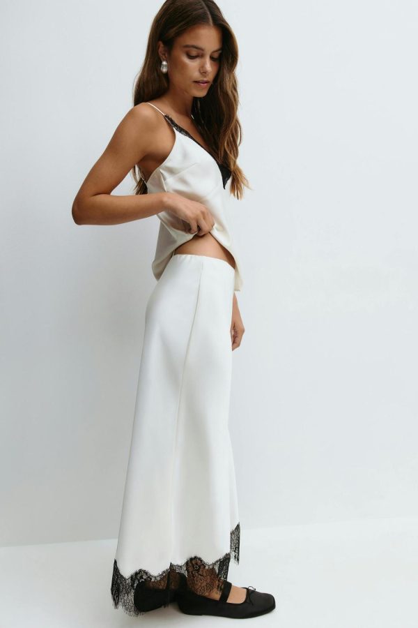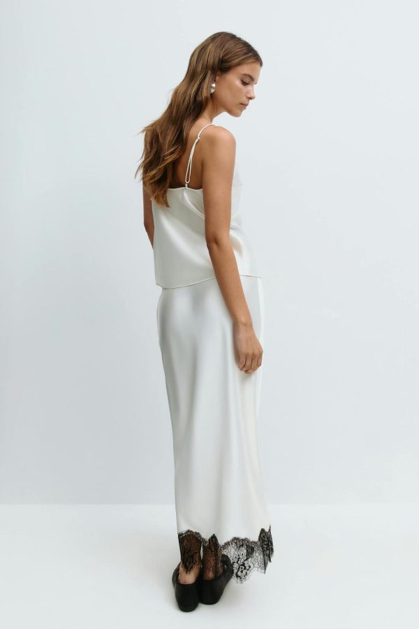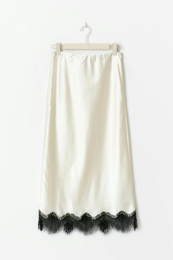 Lång satinkjol med spets nedtill. Kjolen är vit och har glansig kvalitet. Den har hög midja med resår.