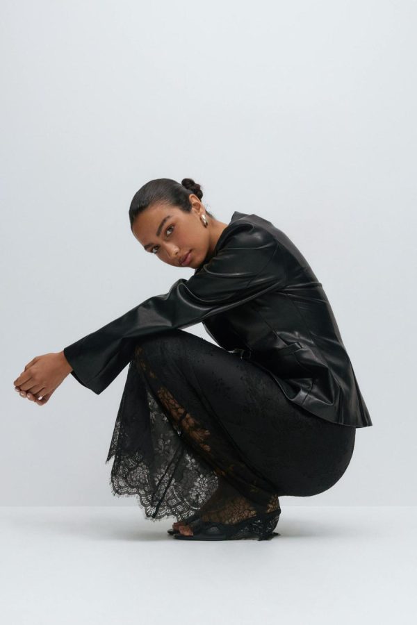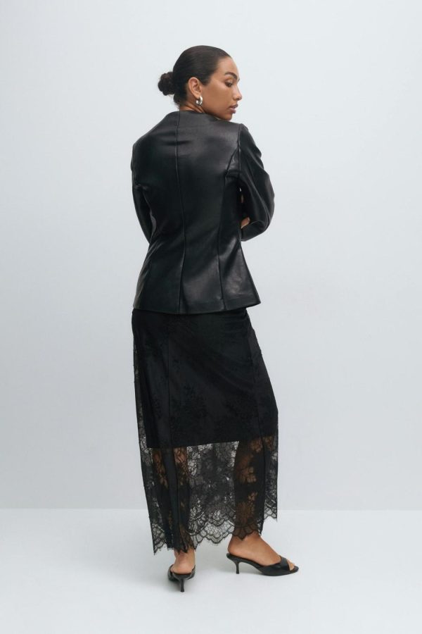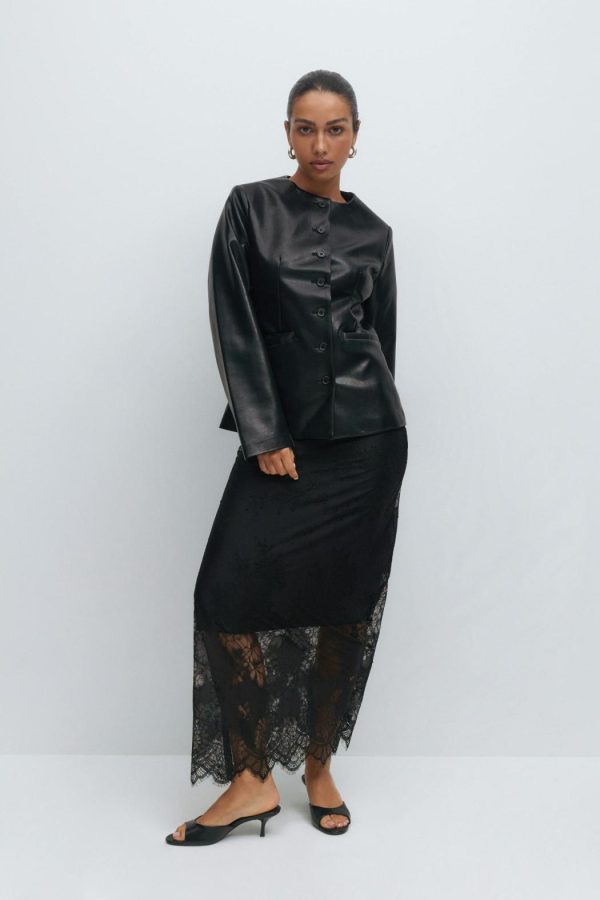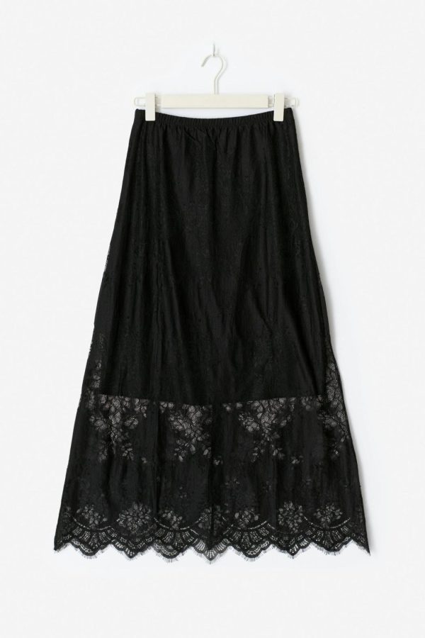 Lång spetskjol med foder. Kjolen är svart och har resår. Den har normal passform, midilängd och hög midja.