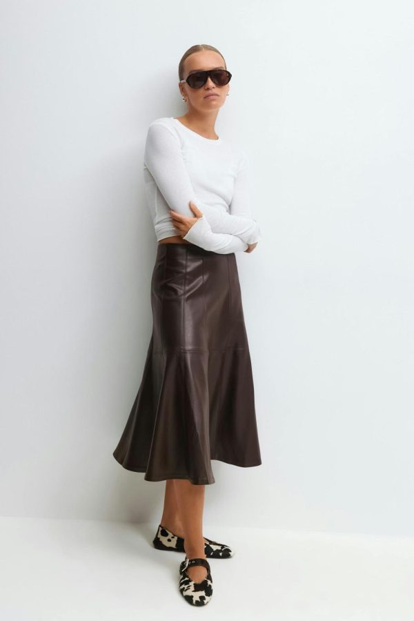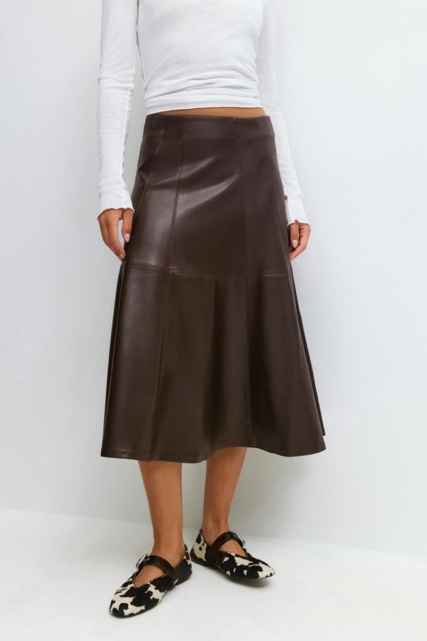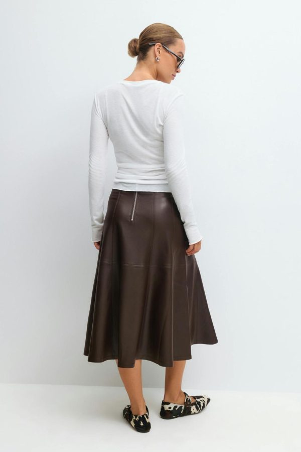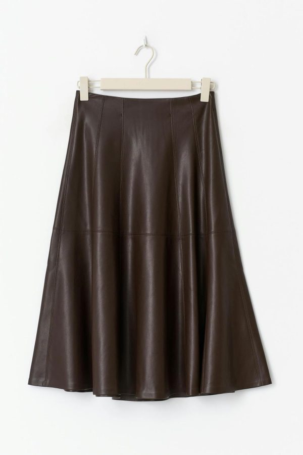 Midikjol i läderimitation med dekorativa sömmar fram och bak. Kjolen är brun och har en dragkedja bak i midjan. Den har en normal passform.