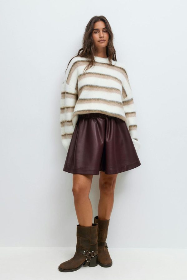 Minikjol i läderimitation med en hög midja med ett elastiskt band. Kjolen är mörklila och har en dekorativ söm nedtill.