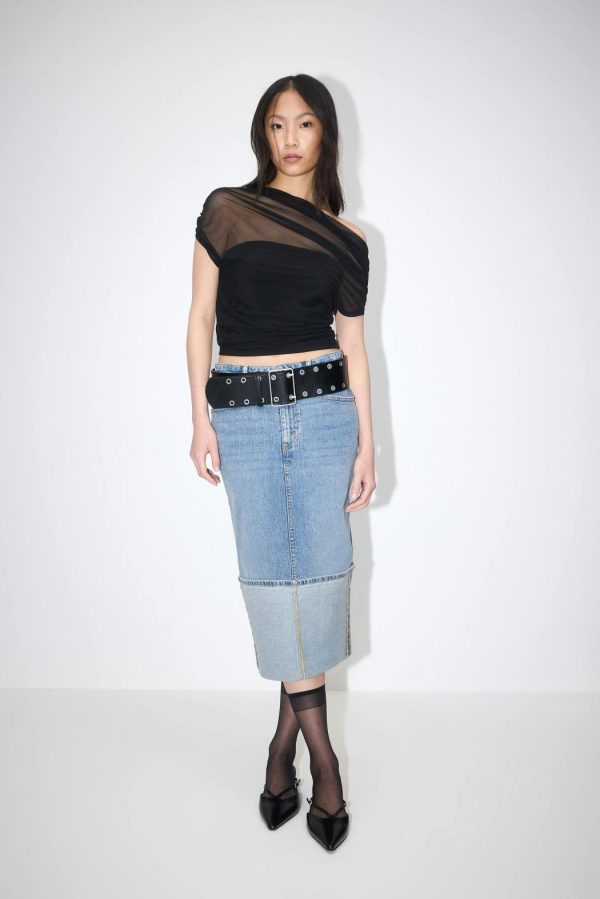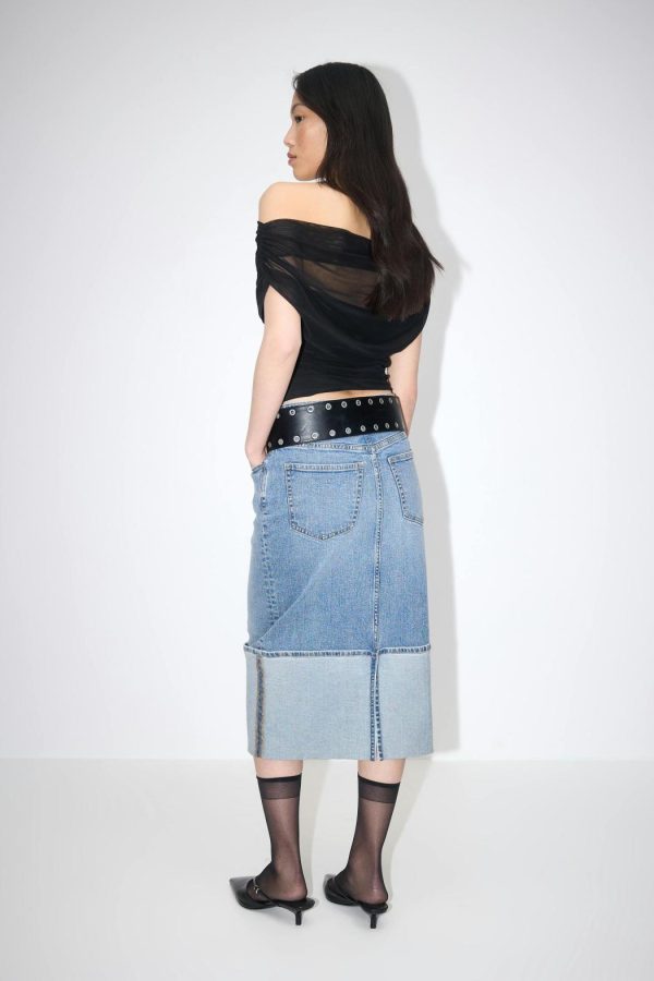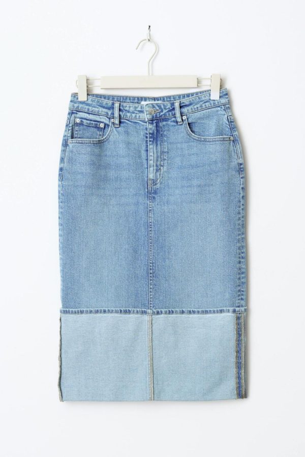 Jeanskjol med uppvikt nederkant. Kjolen är blå och har figurnära passform. Den har hög midja, stretchig kvalitet, dragkedjegylf och fickor fram och bak.