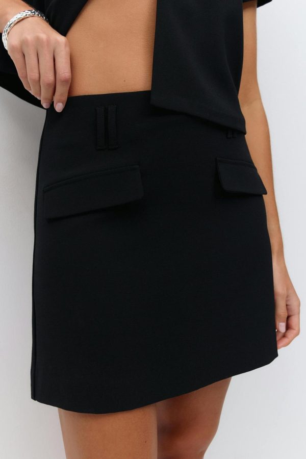Kort kostymkjol med en normalhög midja. Kjolen är svart och har en figurnära passform. Den har en dragkedjegylf och fuskfickor fram.