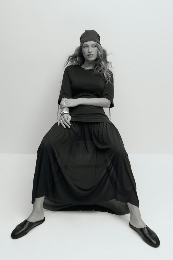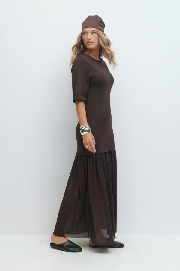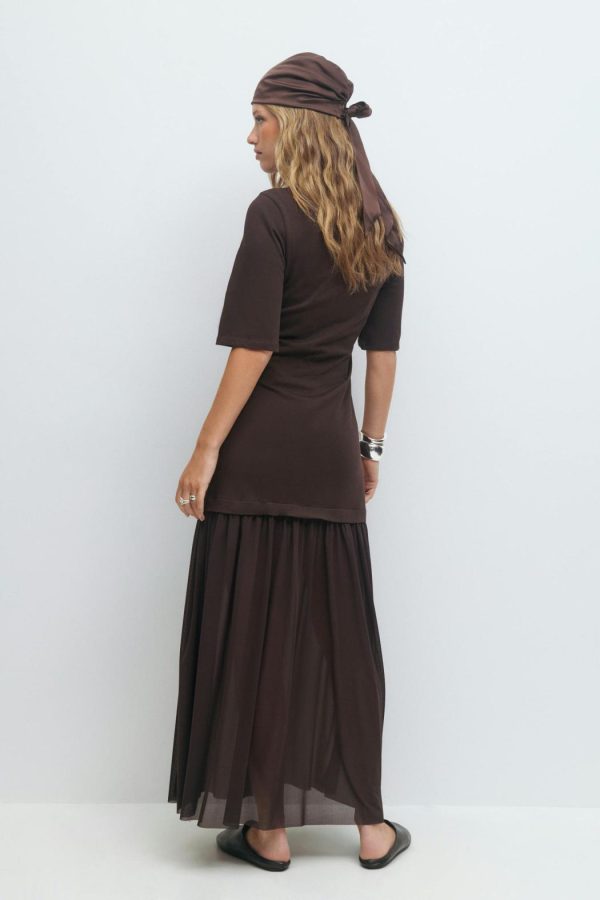 Kortärmad långklänning med t-shirtdesign. Klänningen är brun och har rynkad kjol i mesh med transparent kvalitet. Den har nerhasad midja, rund halsringning och normal passform.
