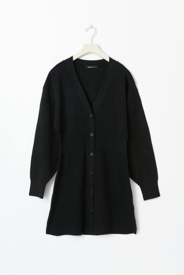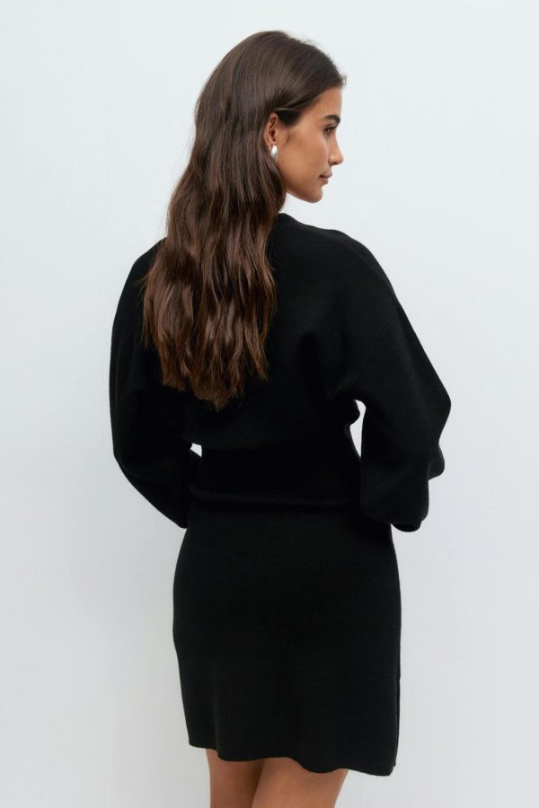 Stickad klänning med knappar framtill. Klänningen är kort, långärmad och svart. Den har figurnära passform, v-ringning och nedhasad axel.