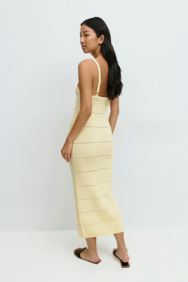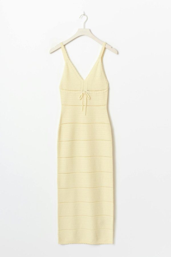 Stickad klänning med midilängd. Klänningen är gul och har en knytning fram. Den har justerbara axelband, vågiga kanter, figurnära passform, v-ringning och håldetaljer.