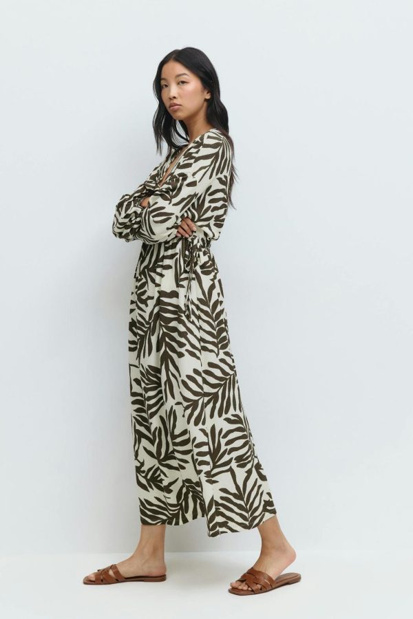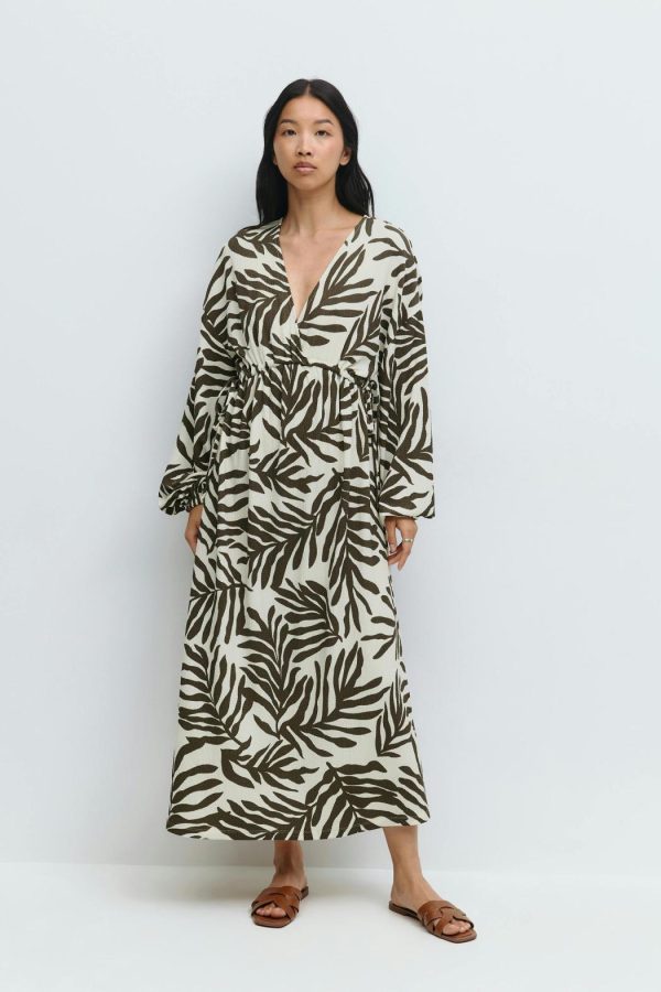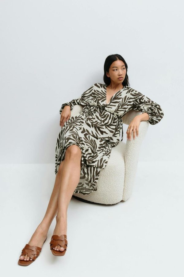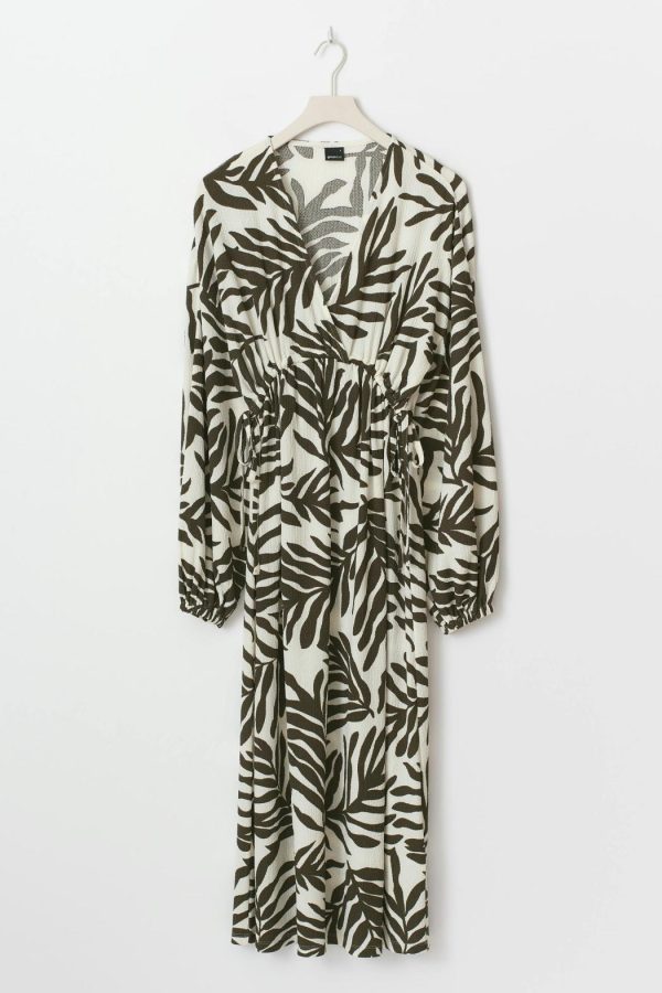 Mönstrad omlottklänning med texturerat tyg. Klänningen har midilängd. Den har ballongärmar, v-ringning, normal passform och knytning i sidan.