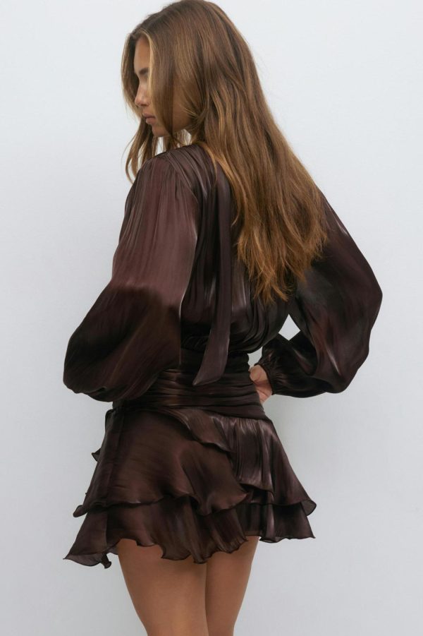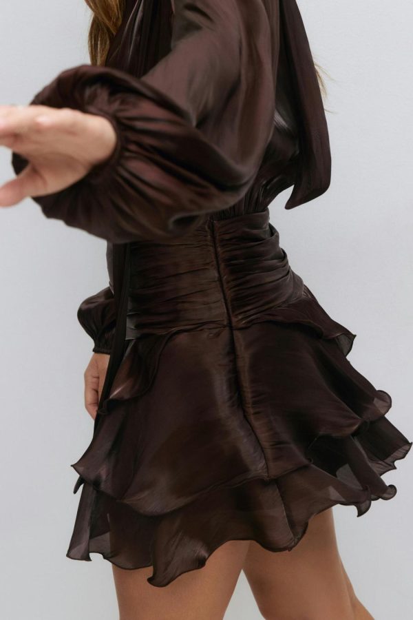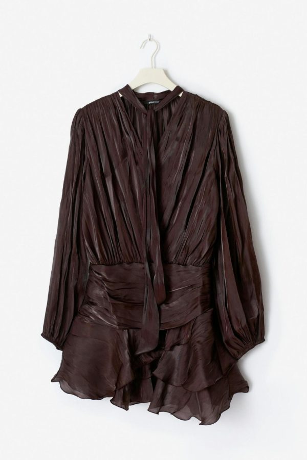 Draperad klänning med scarf. Klänningen är brun och har v-ringning. Den har kort längd, volanger i nederkant, ballongärmar, dragkedjestängning och normal passform.