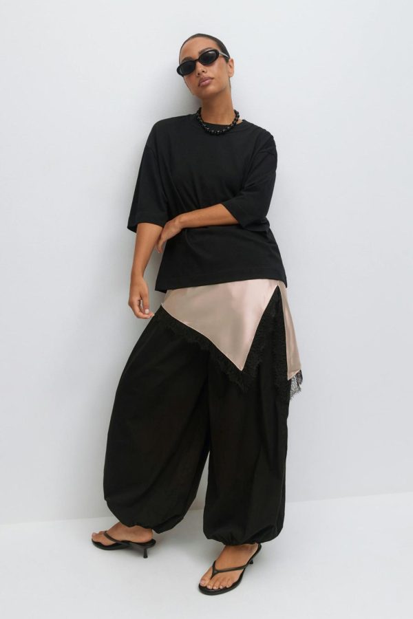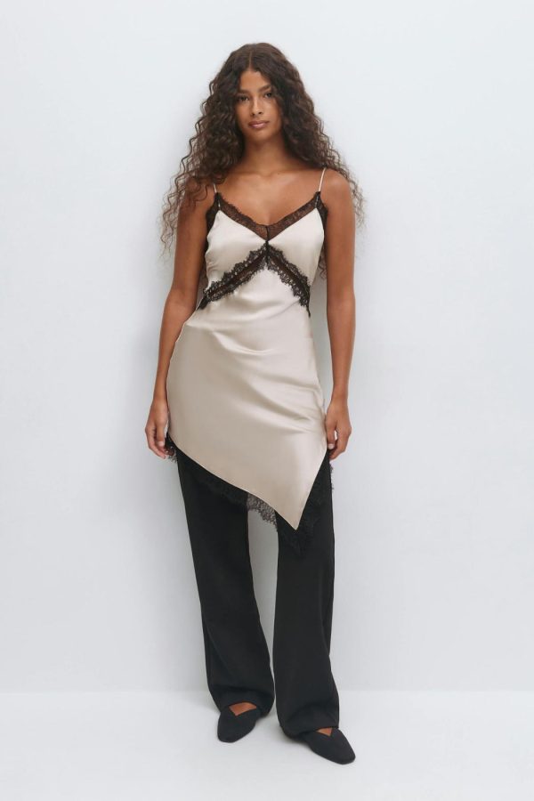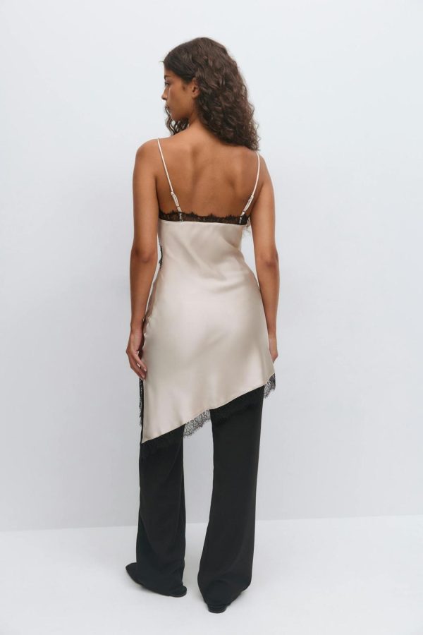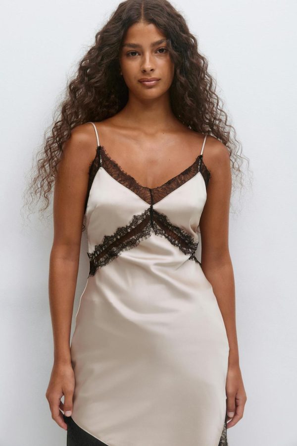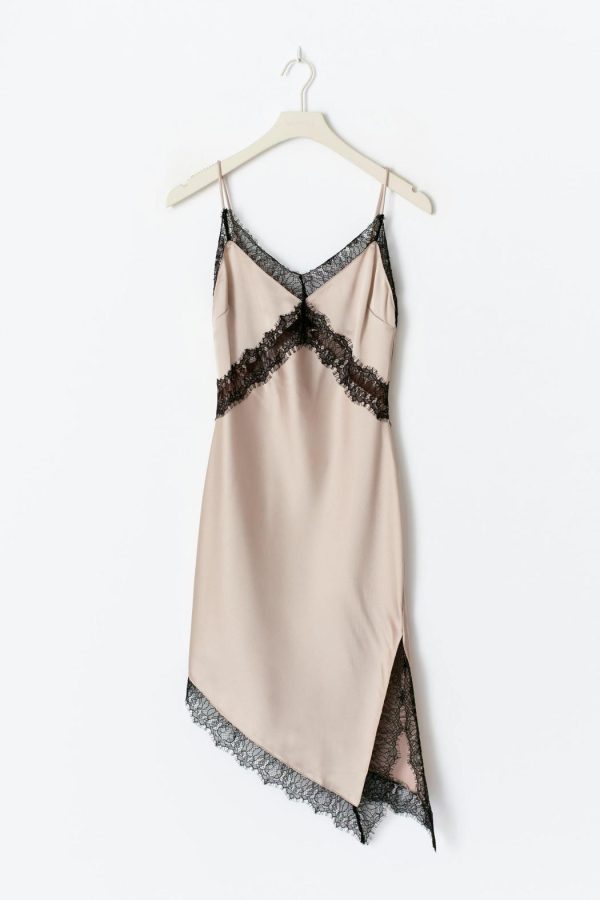 Kort satinklänning med spets i nederkant, under bysten och kring halsringning. Satinklänningen är beige och har smala, reglerbara axelband. Den har slits i sidan, v-ringning, glansigt material och asymmetrisk nederkant.