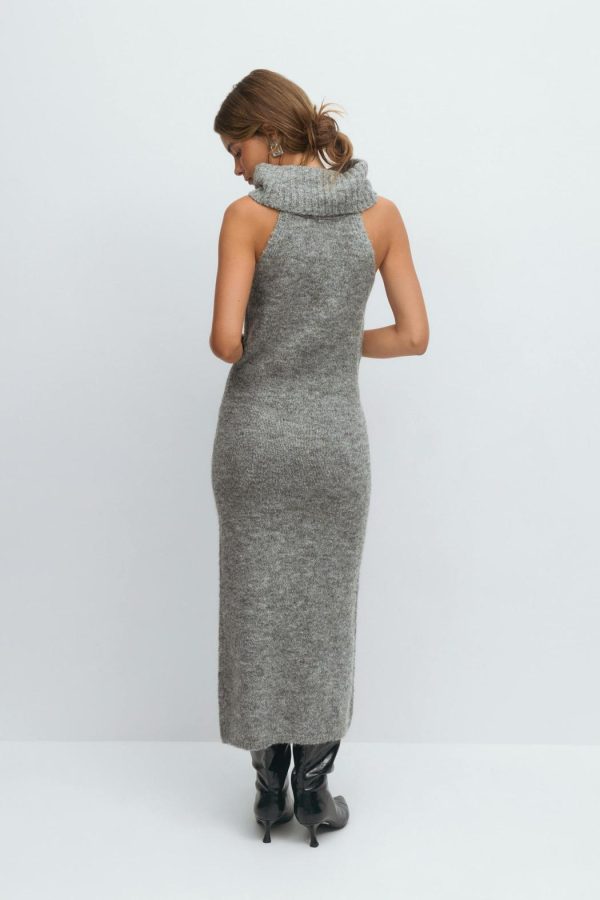 Ärmlös stickad klänning med polokrage. Klänningen är grå och har figurnära passform.