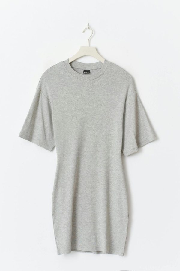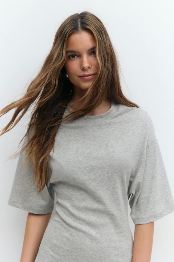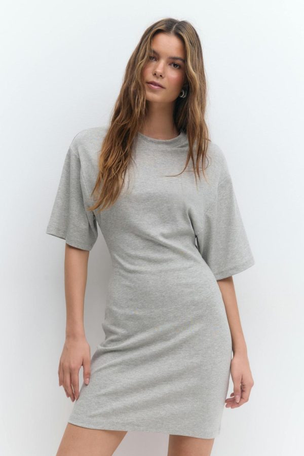 Kort t-shirtklänning med vida, korta ärmar. Klänningen är grå och har intagen midja. Den har normal passform och rund halsringning.