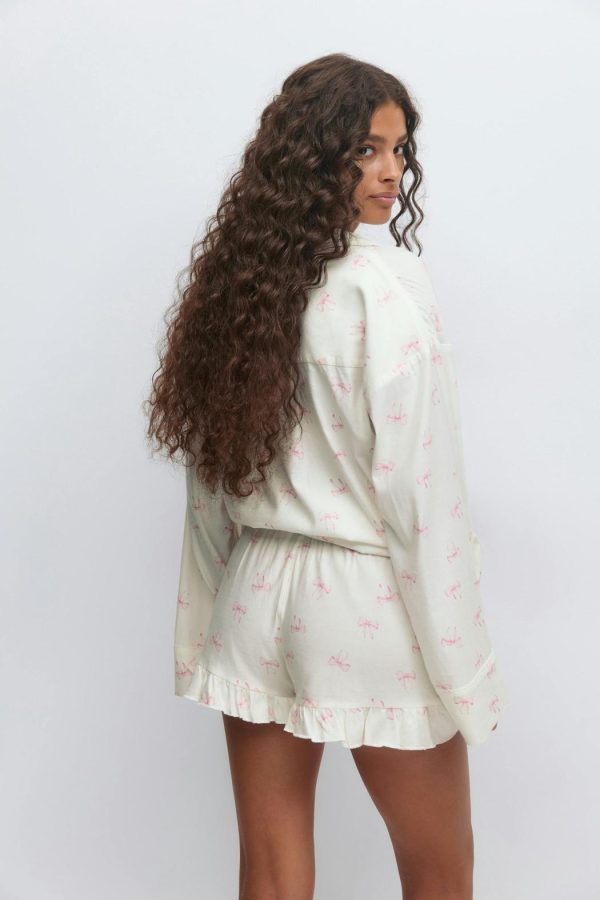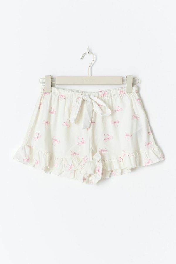 Korta pyjamasshorts i flanell med små rosetter. Shortsen är vita och har volanger nedtill. De har låg midja med resår och knytband i satin framtill.