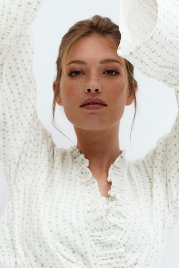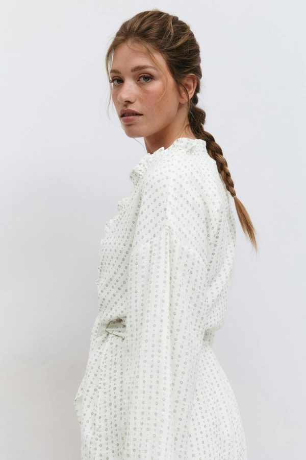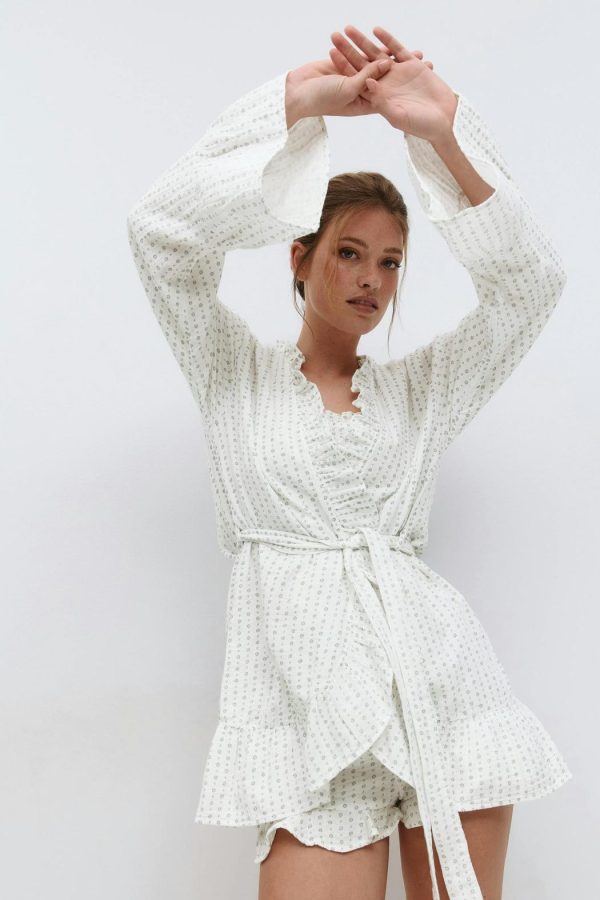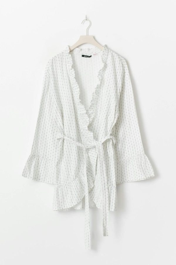 Kort morgonrock i bomull med små blommor. Morgonrocken är vit och grå och har långa, utsvängda ärmar. Den har generös passform, volangkant framtill och vid ärmslut och ett knytband i midjan.