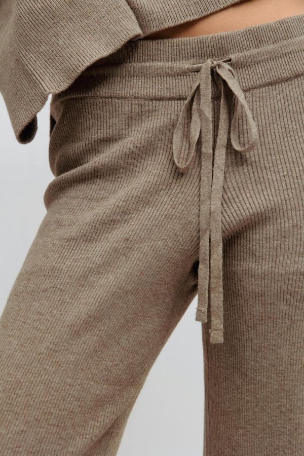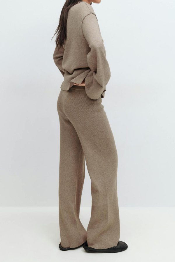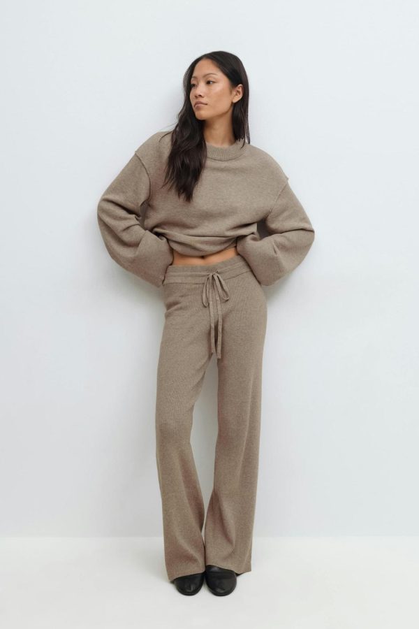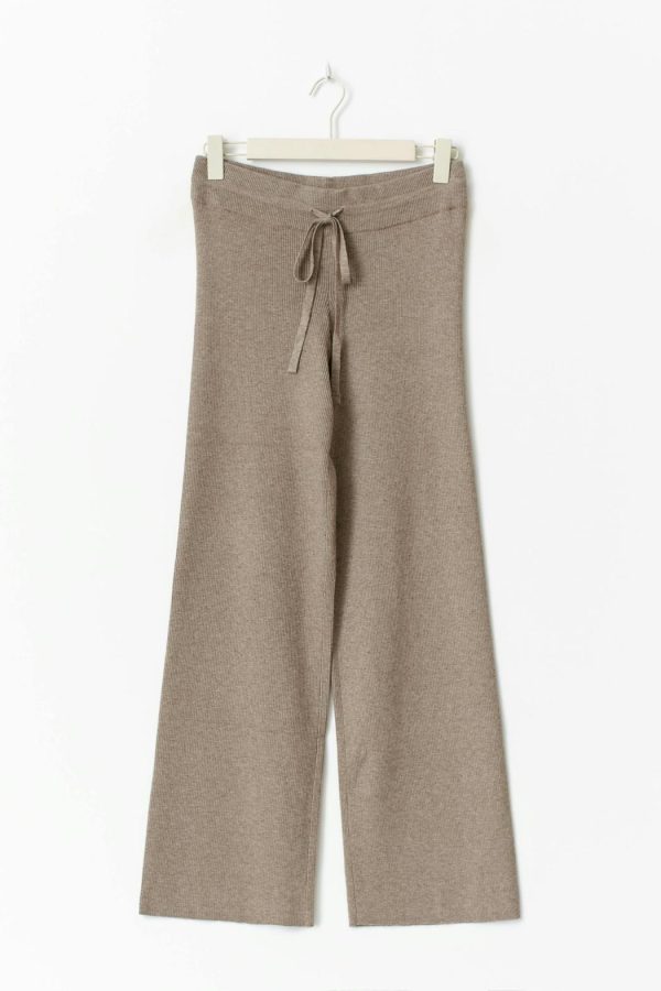 Stickade byxor med en ribbad kvalitet. Byxorna är bruna och har en normalhög midja. De har en normallängd, raka ben, en knytning i midjan och en ribbad linning.