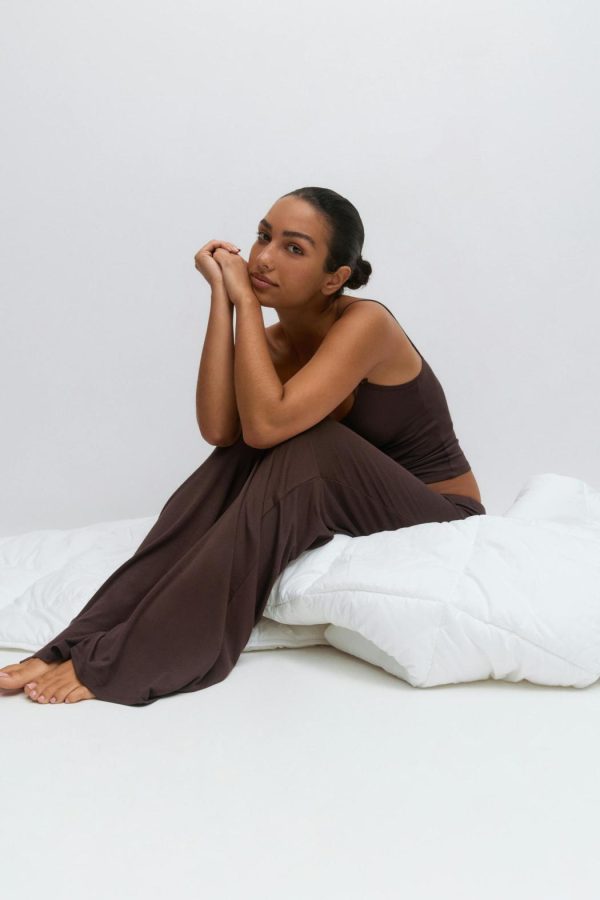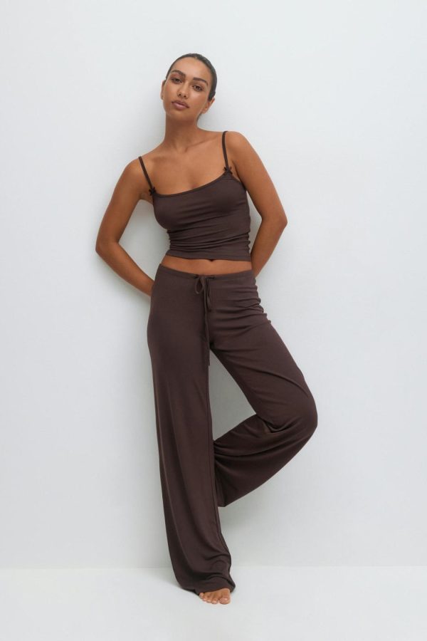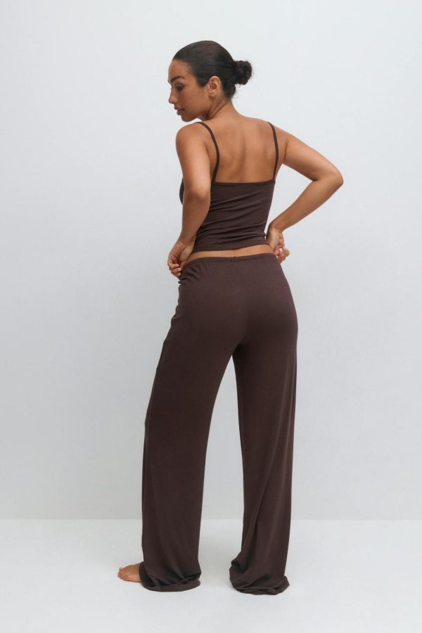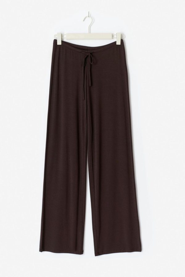 Mysbyxor med mjuk kvalitet. Byxorna är bruna och har låg midja. De har normal passform, knytning framtill, raka ben med fullängd och resår i midjan.