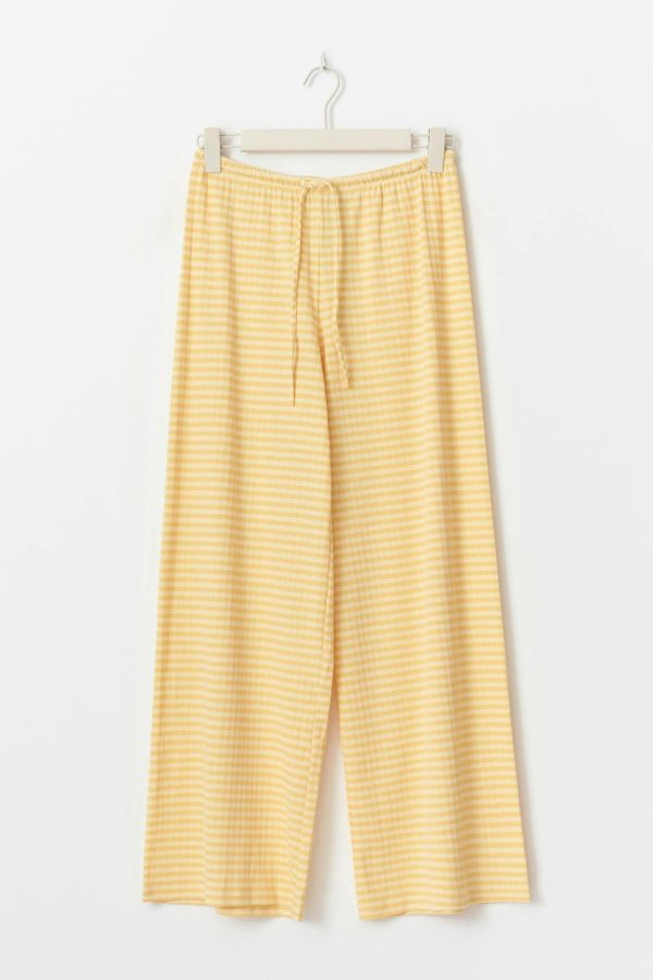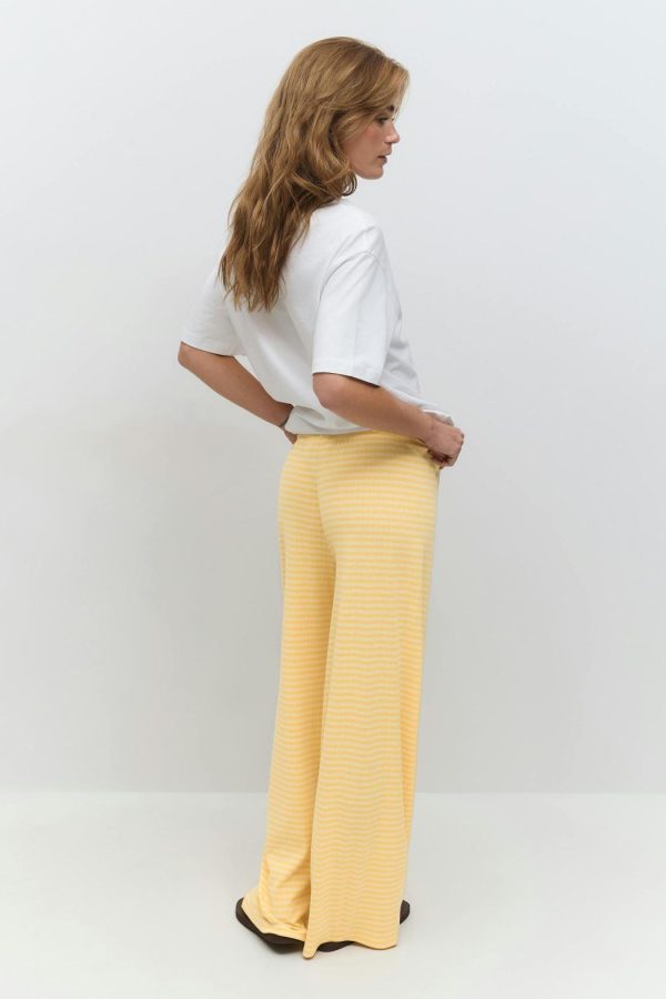Randiga byxor med knytning fram. Byxorna är gula och har lös passform. De har låg midja och mjuk kvalitet.
