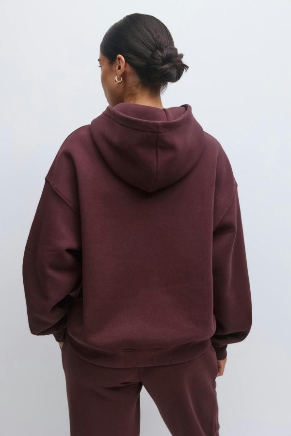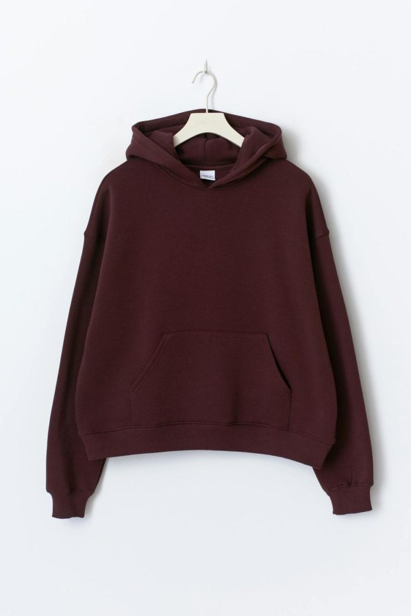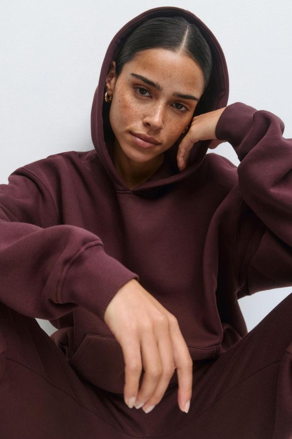 Oversized hoodie med känguruficka framtill. Hoodien är vinröd och har fodrad huva med dragsko. Den har nedhasade axlar och ribbad mudd vid ärmslut och i nederkant.