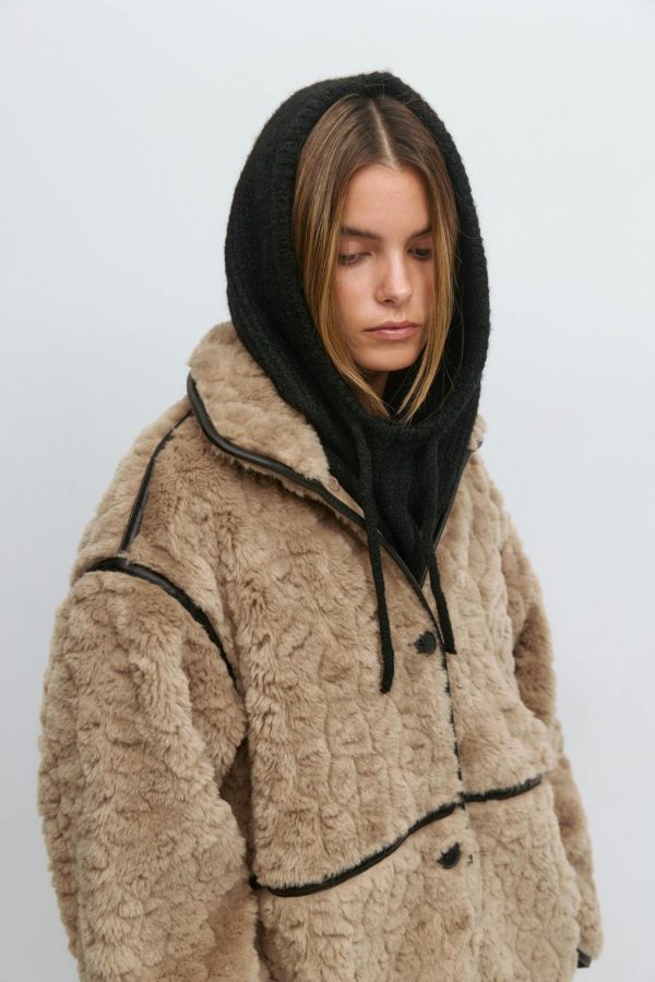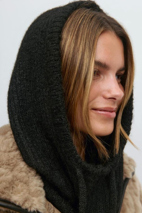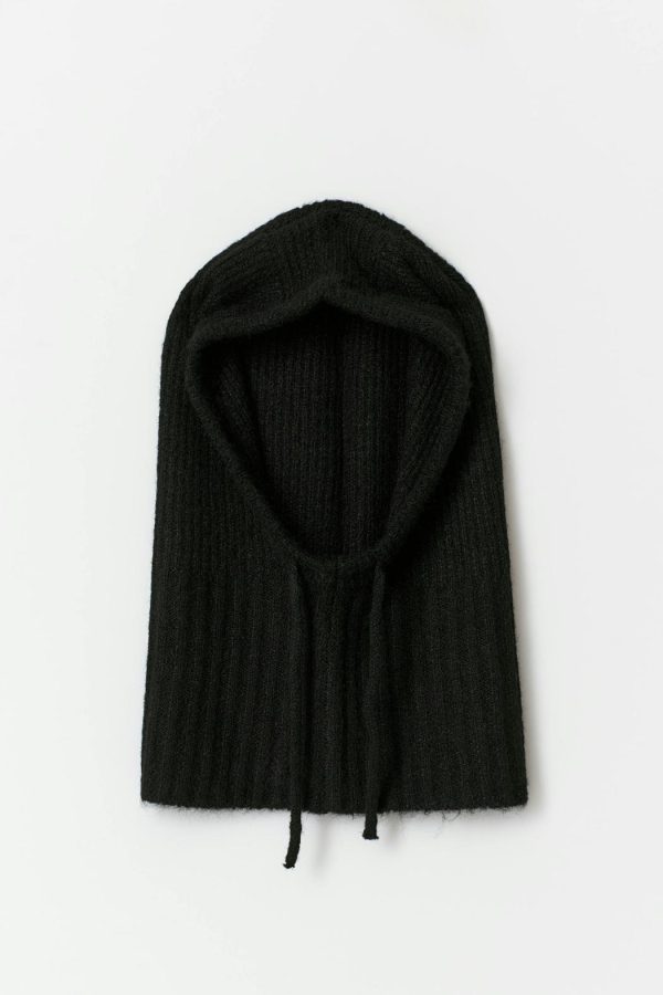 Stickad balaklava med oversize fit. Balaklavan är svart och har reglerbar dragsko vid öppningen.