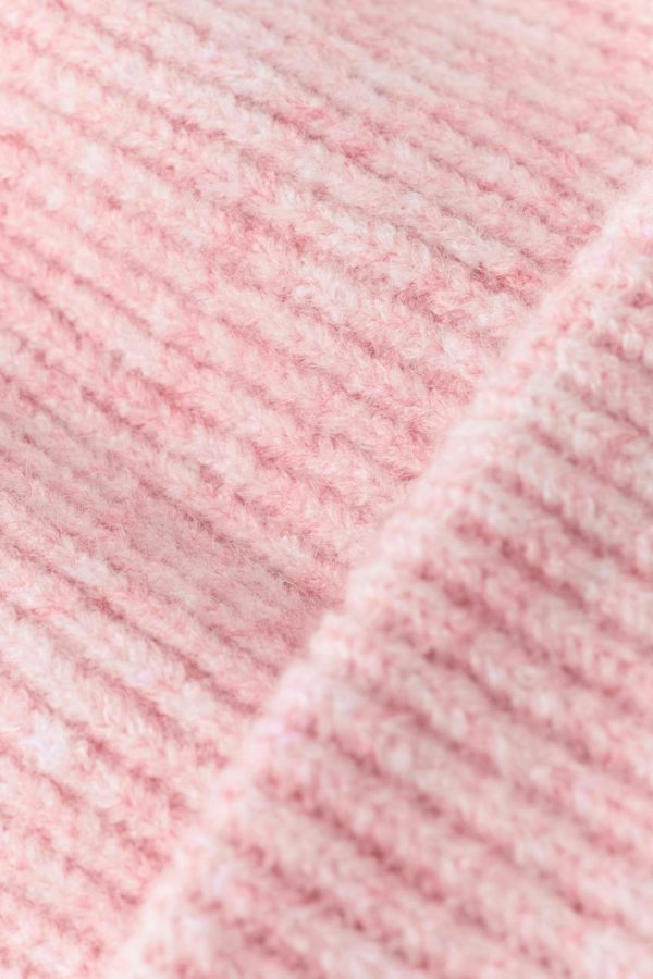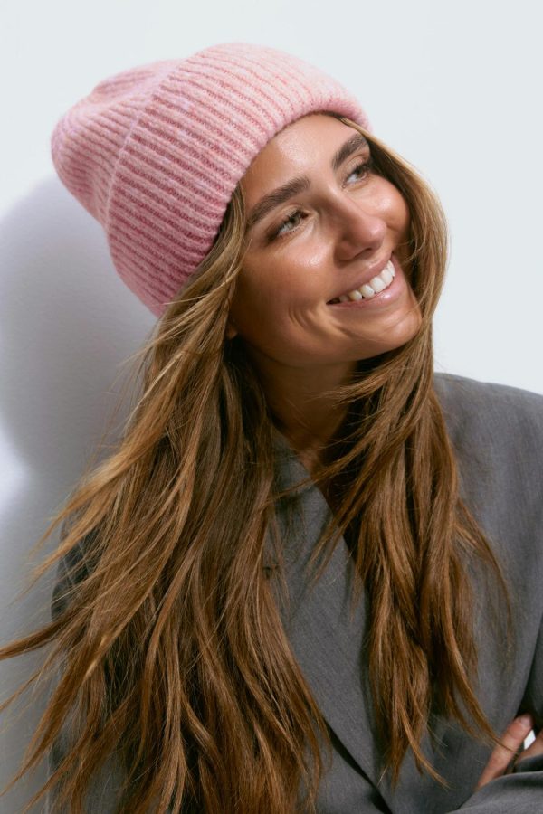 Ribbstickad mössa med bred, uppvikt kant. Mössan är brun och har figurnära passform.