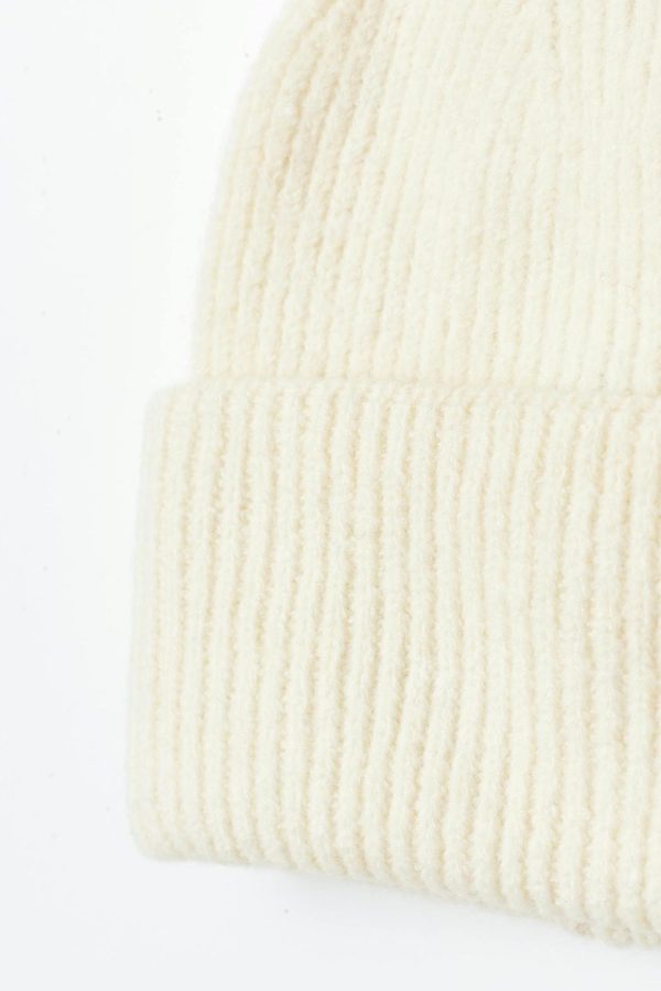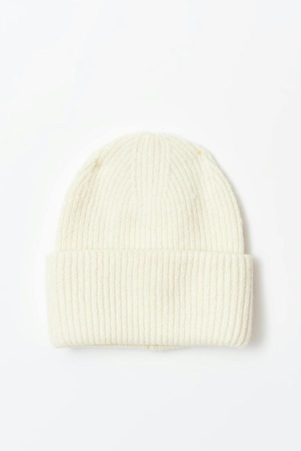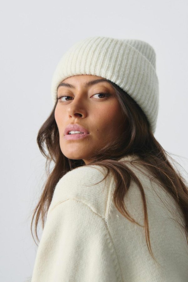 Ribbstickad mössa med bred, uppvikt kant. Mössan är vit och har figurnära passform.
