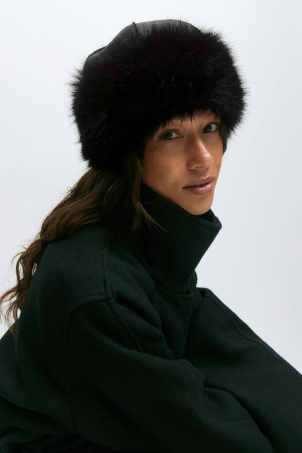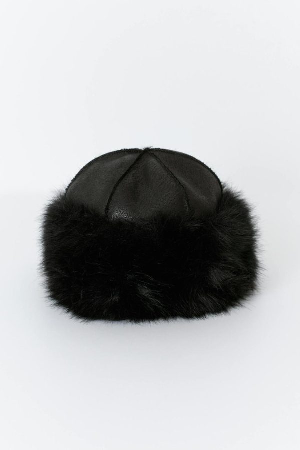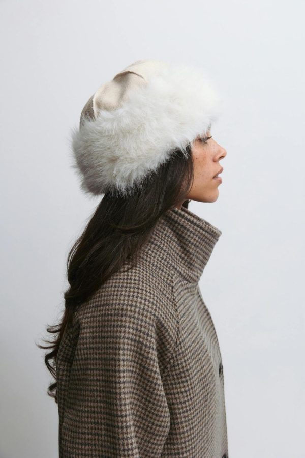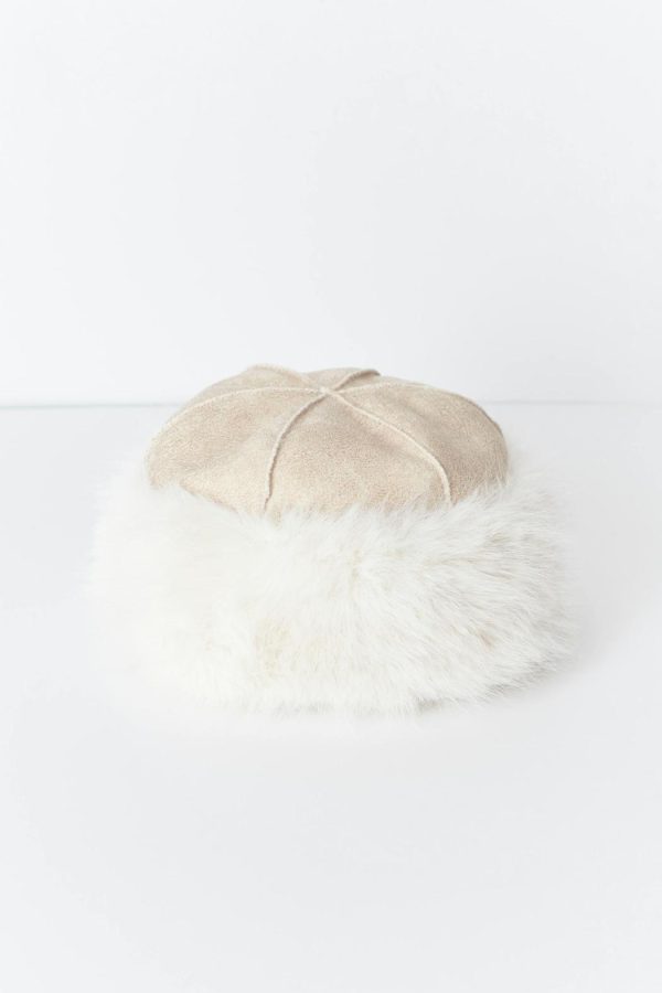 Pälsmössa i skinnimitation med bred fuskpälskant. Mössan är vit och har dekorativa sömmar upptill.