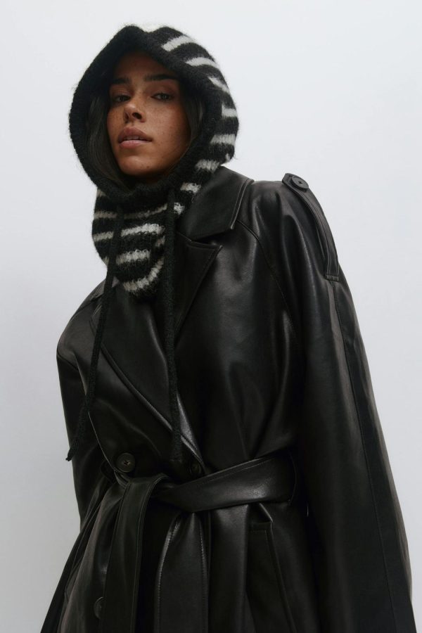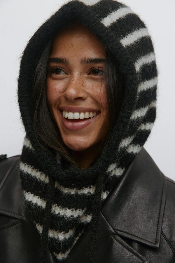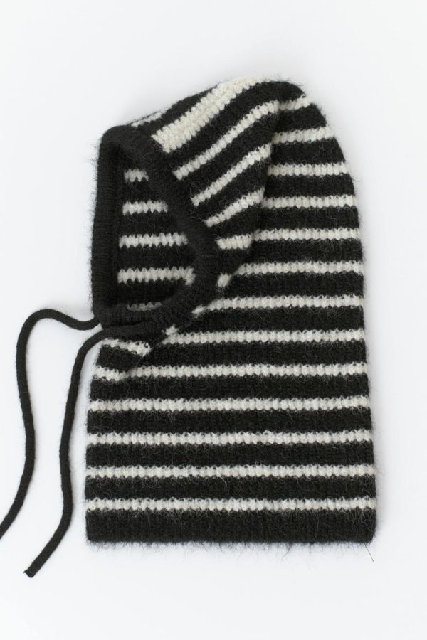 Stickad balaclava med knytsnören i sidorna. Balaclavan är svart och vit och har ett randigt mönster.