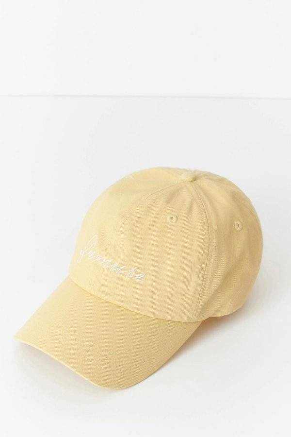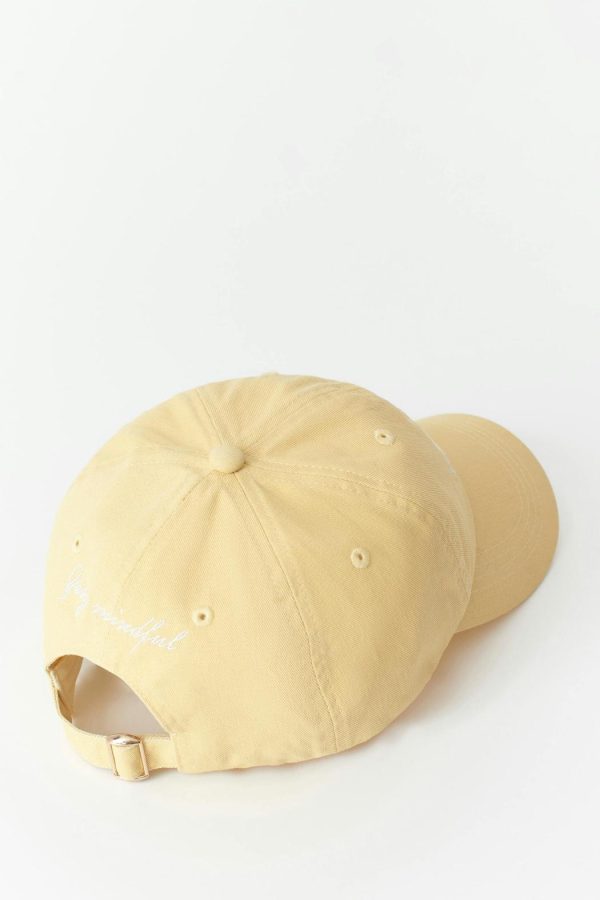 Keps med broderad text framtill. Kepsen är gul och har urtvättad look. Den har reglerbar slejf baktill.