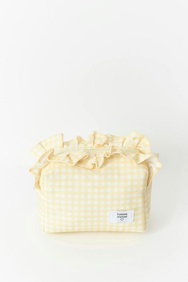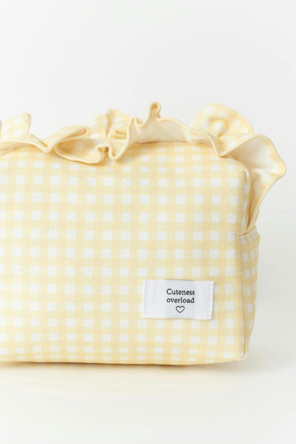 Rutig sminkväska med volangkant upptill. Sminkväskan är gul och har en dragkedjestängning. Den har en etikett framtill.