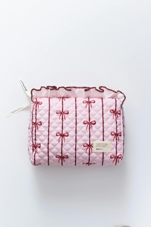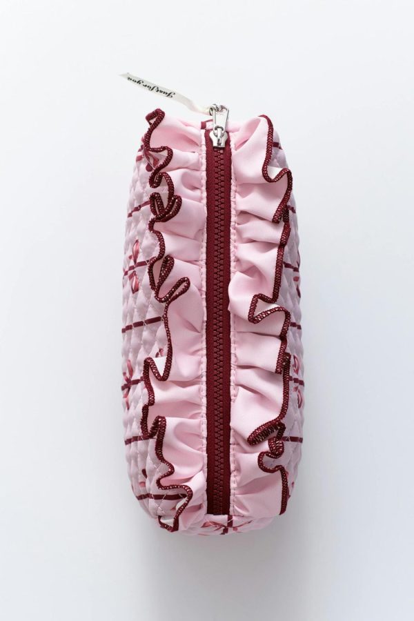 Mönstrad sminkväska med rosetter. Sminkväskan är rosa och har en volangkant upptill.