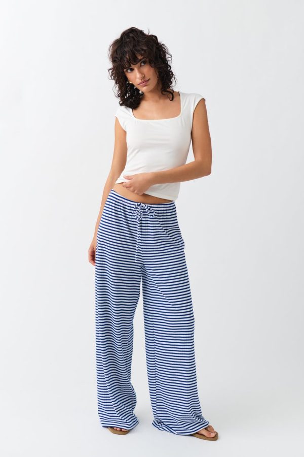 Randiga byxor med knytning fram. Byxorna är blåa, vita och raka. De har lös passform, låg midja och mjuk kvalitet.