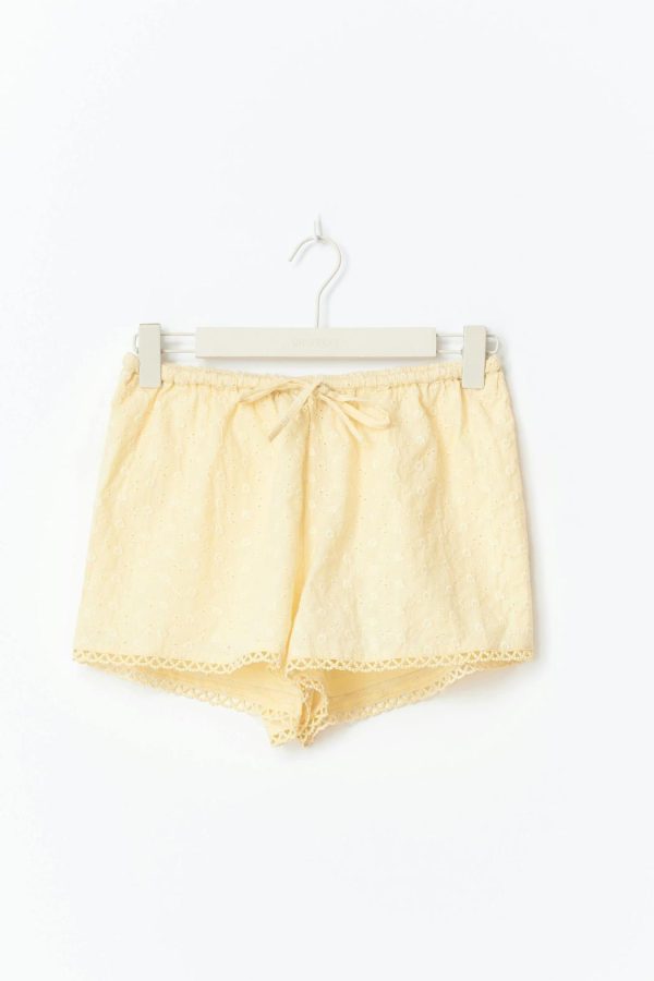 Broderade shorts med låg midja. Shortsen är gula och har knytning fram. De har normal passform, resår i midjan, kort längd och spetskant nedtill.