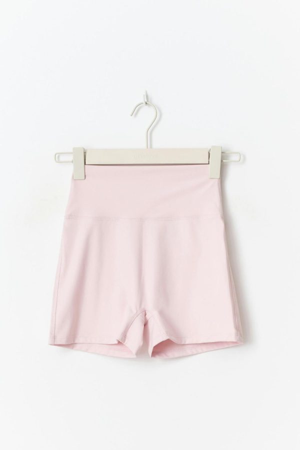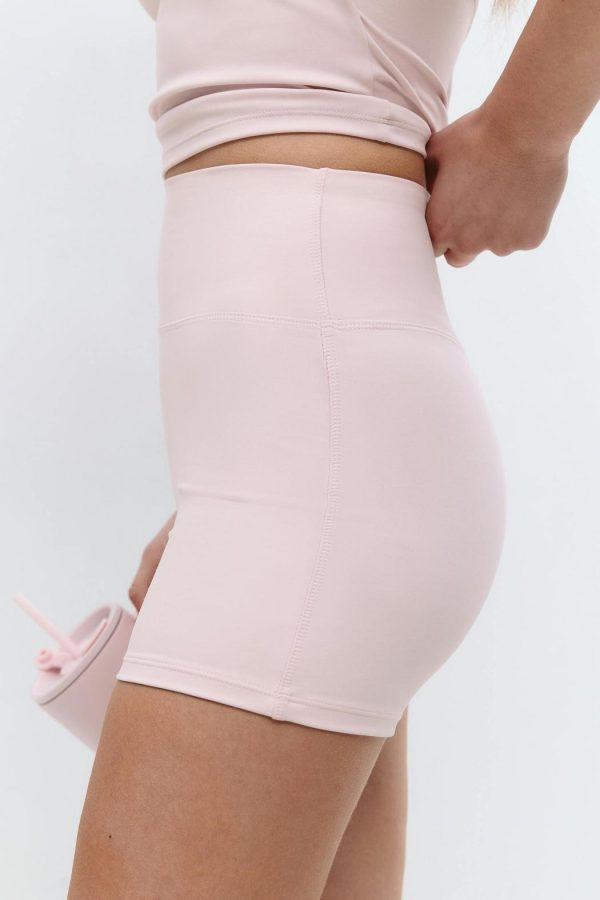 Korta hotpants med hög midja. Shortsen är rosa och stretchiga och har figurnära passform. De har foder.