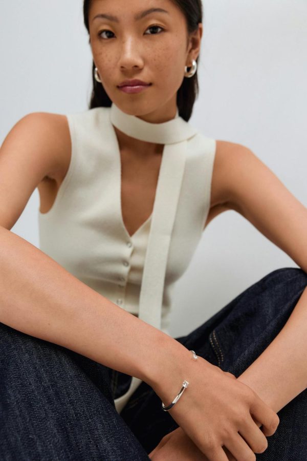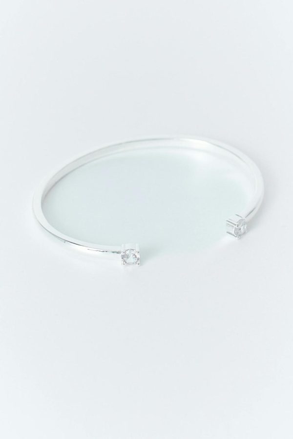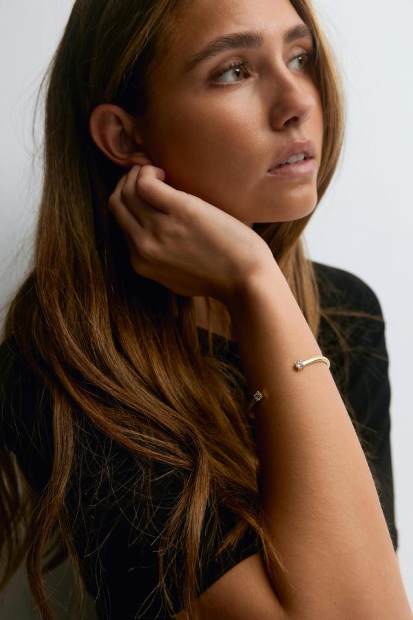 Smalt armband med små stenar vid ändarna. Armbandet är guldfärgat.